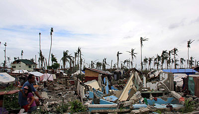 Tacloban und die Gegend im Umkreis von ca. 100 km sind zu 90 Prozent zerstört. Es ist wie im Krieg und schlimmer, als ich dachte. Nahezu jedes Haus und jede Schule hat ein zerstörtes Dach. Fabrikhallen sind wie Kartenhäuser zusammengefallen. Die Kathedrale von Tagloban ist schwer beschädigt. Die Straßen wurden inzwischen vom Schutt geräumt, die schlimmsten Trümmer sind beseitigt und die Regierung baut Barackenunterkünfte. Überall sieht man blau gekleidete Arbeiter beim Wegräumen des Schutts. Unterwegs kommen wir an einer Kapelle mit dem Massengrab für die aufgefundenen Leichen vorbei. Die Angehörigen haben Holzkreuze und Fotos aufgestellt.