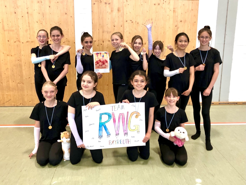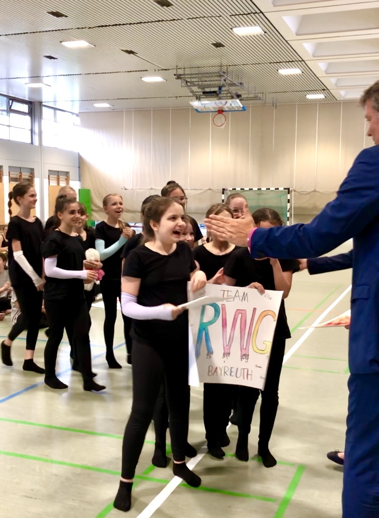 Nach einer langen Corona-Pause konnten nun endlich wieder Bezirksmeisterschaften im Tanz stattfinden, die in Bayreuth ausgetragen wurden. Wir nahmen mit einem ganz jungen Team bestehend aus den 5.Klässlerinnen des Profils Tanz teil. Für die meisten Mädchen war dies ihr erster Wettkampf, sodass die Aufregung sehr groß war.