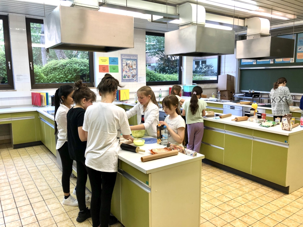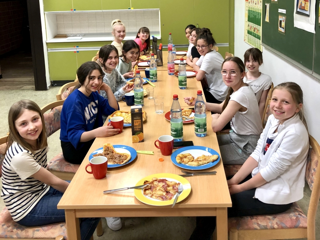 Aufgeregt trafen die Mädchen am frühen Abend in der Schule ein und gingen dann zu einer Trainingseinheit in die Turnhalle. Nach verschiedenen Stellproben und konzentriertem Arbeiten, war der Hunger groß. In der Schulküche wurde unter Gelächter zu coolen Beats Pizza selbst gemacht. Anschließend konnte sich die Gruppe das Video ihres Tanzes auf Leinwand ansehen und tanzte noch einmal begeistert mit. Am Abend herrschte ausgelassene Stimmung, irgendwann fielen dann aber doch auch der Letzten die Augen zu. Nach einem Frühstück am nächsten Morgen gingen die Mädels zur zweiten Stunde wieder in den Unterricht.