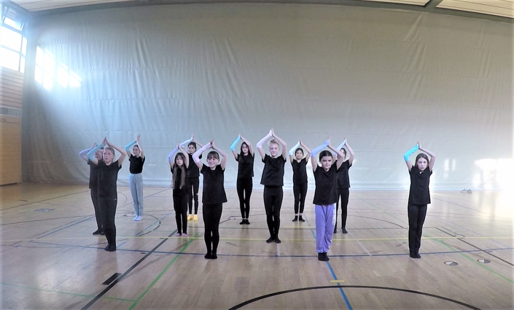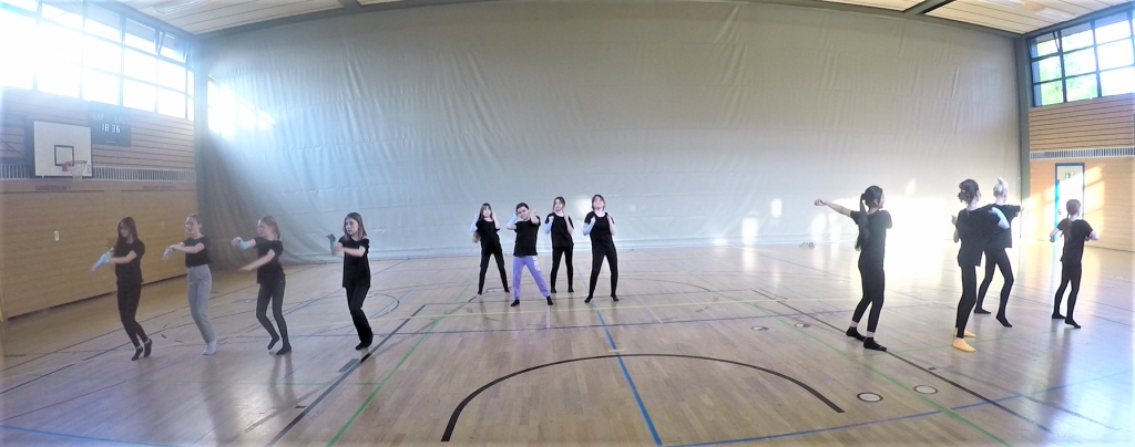 Die Mädels des Profils Tanz übernachteten in der Schule, um als Team noch besser zusammenzuwachsen und um vor den Bezirksmeisterschaften ihren Tanz einmal auf der Größe der Wettkampffläche üben zu können. Normalerweise trainieren die 5.Klässlerinnen in einem Ballettstudio, das viele Vorteile bietet, die Tiefe von 12m hat aber nur unsere Turnhalle.