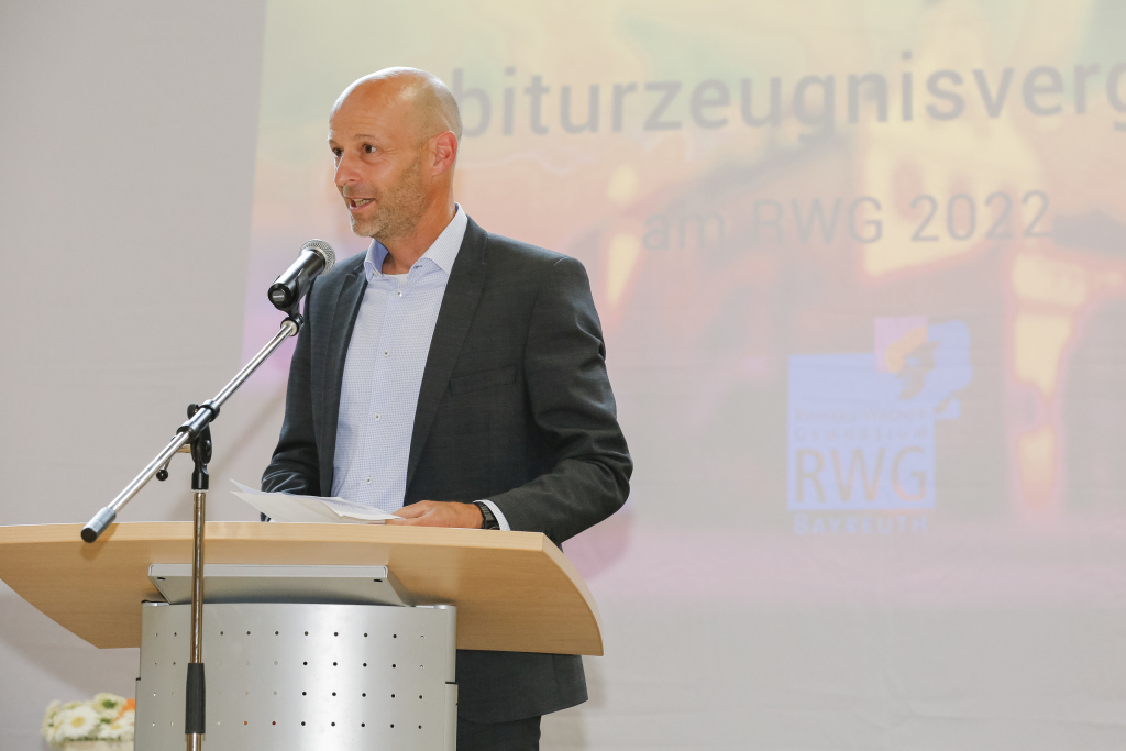 Zu diesem Schluss kam Frau Dr. Karin Hüttner als stellvertretende Elternbeiratsvorsitzende und Abiturientinnenmutter. Sie erinnerte an manchmal auch stressige Zeiten in den vergangenen acht Jahren, in denen auf die schnelle noch ein Bio-Projekt oder andere BastellHerausforderungen auch unter großem Einsatz der Elternschaft gemeistert werden mussten. Der Elternbeiratsvorsitzende und Abiturientenvater Herr Sebastian Bojanowski blickte dagegen in die Zukunft und gab den Scheidenden mit auf den Weg, dass sie bei allem, was sie anfingen, sich von den Grundprinzipien Verantwortungsbewusstsein, Mut, Verbindlichkeit und Neugier leiten lassen sollten.