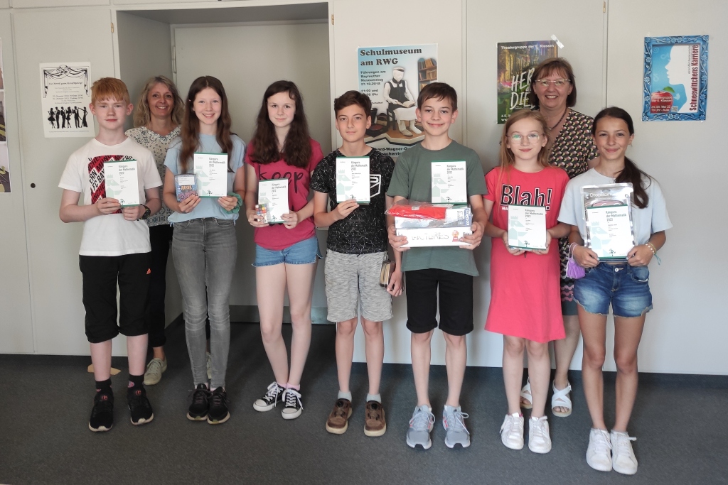 Nach einjähriger Pause hat das RWG 2022 wieder am Wettbewerb „Känguru der Mathematik“ teilgenommen und konnte gleich ein herausragendes Resultat verbuchen. Lukas Jahn (6a) hat es geschafft, alle 24 Aufgaben richtig zu beantworten, und erreichte somit als erster RWGler die Maximalpunktzahl 120 seiner Altersstufe. Diese sensationelle Leistung, die nur ein Promille aller teilnehmenden Sechstklässler erreichte, wurde zusätzlich zum 1. Preis des Wettbewerbs mit einem RWG-Sonderpreis gewürdigt. Da ist es wirklich nicht verwunderlich, dass Lukas auch noch das T-Shirt für den größten Kängurusprung, die größte Anzahl aufeinanderfolgender richtig gelöster Aufgaben aller Teilnehmer des RWG, gewonnen hat. In seiner gewohnt bescheidenen Art, nahm Lukas die Glückwünsche und seine vielen Preise von der Schulleiterin Frau Graf entgegen.