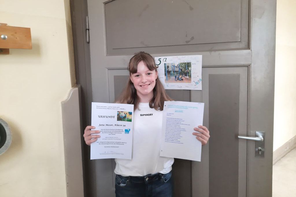 Als einer der Gewinnertexte konnte schließlich der Einzelbeitrag von Jette (5a) überzeugen, die einen ‚Corona-Rap‘ zum Thema eingereicht hatte; aus der 6. Jahrgangsstufe stammen weitere zwei prämierte Kreativ-Beiträge, nämlich ein Text von Franz sowie ein Teambeitrag von Sara und Hannah (alle Klasse 6c).