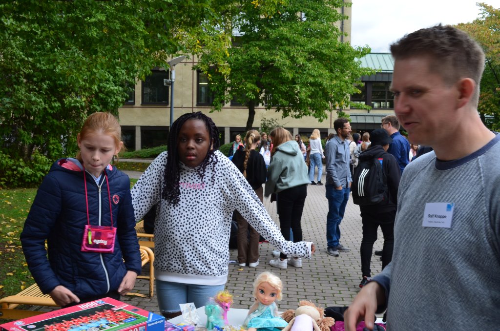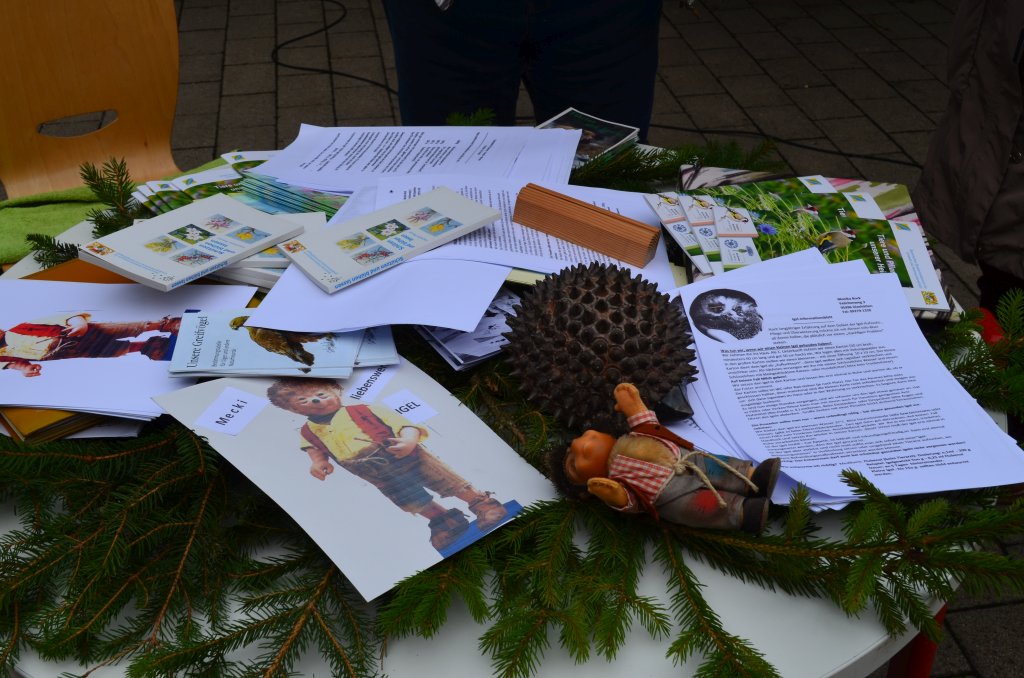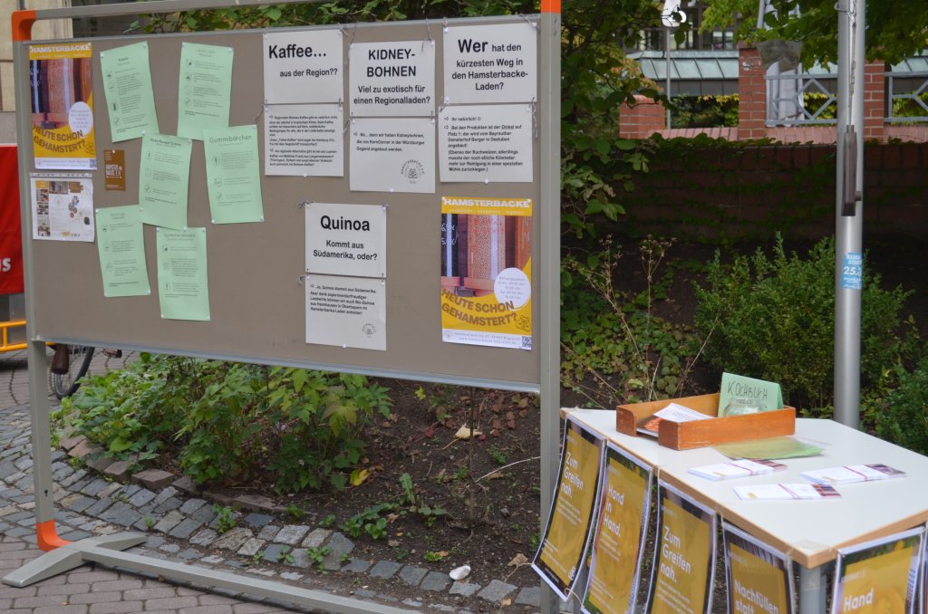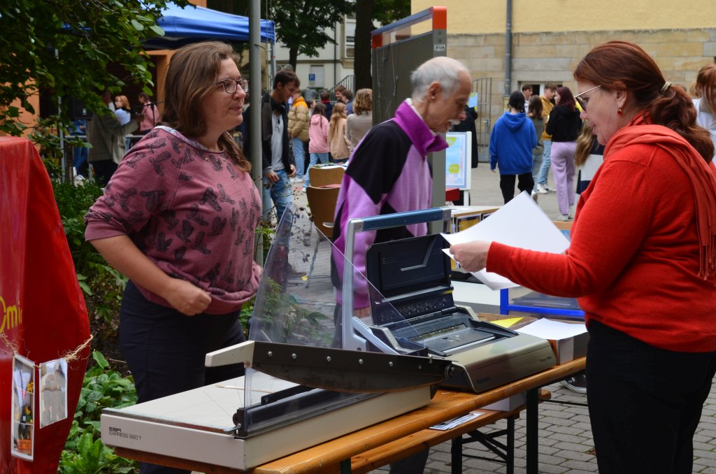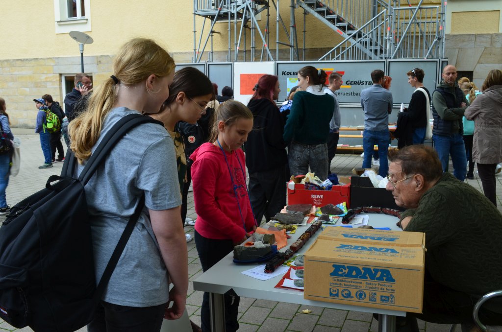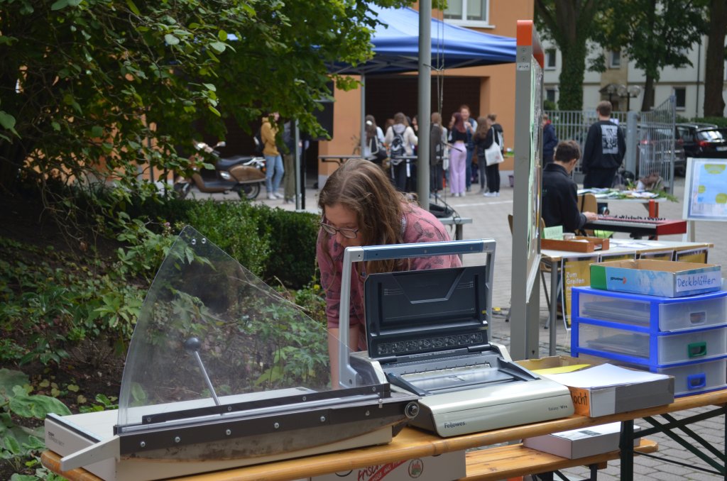 Doch der Marktplatz hatte noch mehr zu bieten. So konnten die Schülerinnen und Schüler und deren Eltern von der Expertin Frau Bock Wissenswertes zu naturnahen Gärten und heimischer Artenvielfalt von der Igelexpertin Frau Bock erfahren und sich über die besondere Bedeutung von Flora und Fauna informieren. Mitarbeiterinnen des foodsharing e.V. brachten gerettete Lebensmittel mit und berichteten über ihre Arbeit, die bei manchem Besucher für Erstaunen sorgte: „Lebensmittel ganz umsonst? Ich hätte nicht gedacht, dass die Läden das wegwerfen“, konnte man Besucher sagen hören. Auch die Hamsterbacke e.V. stellte ihren Unverpacktladen vor, in dem sich Kunden mit regionalen, unverpackten und ökologisch produzierten Lebensmitteln versorgen können. Bei der Mitmachstation des Papierpilzes wurden aus recyceltem, einseitig bedrucktem Papier individuelle Schreibblöcke gefertigt. Die Auswahl der unterschiedlichen Motive auf dem Papier sorgte für Begeisterung bei vielen Blockmacher*innen.