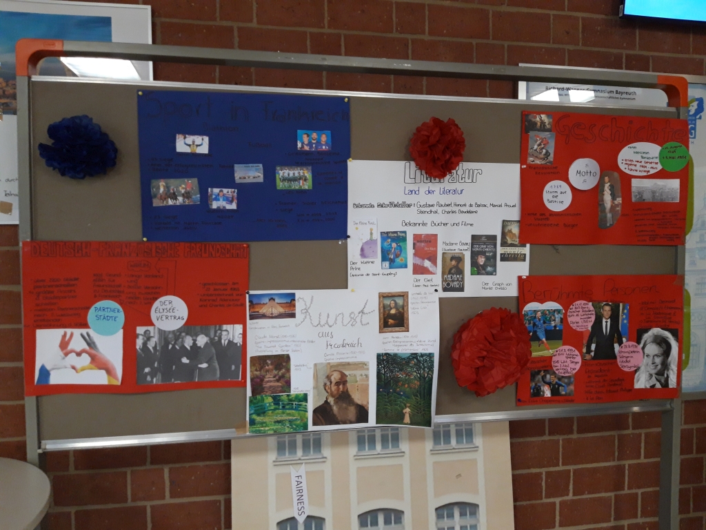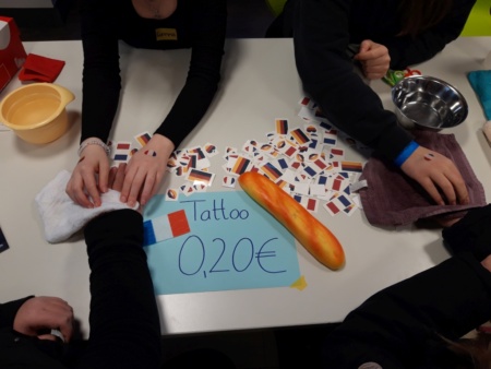 Das P-Seminar Französisch hatte im Vorfeld amüsante deutsch-französische Spiele erstellt, u.a. Monopoly, Vokabel-Dart, Activity, Memory und Kahoot, und begeisterte die Klassen und Lehrkräfte mit deutsch-französischen Lernplakaten und Tattoos. Für das leibliche Wohl war außerdem dank Croissants und Crêpes gesorgt. Eine großzügige Spende der in Mistelgau ansässigen Firma Hermos ermöglichte die Finanzierung des Events im Vorfeld. Danke – merci, et vive l’amitié franco-allemande!