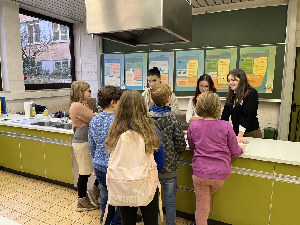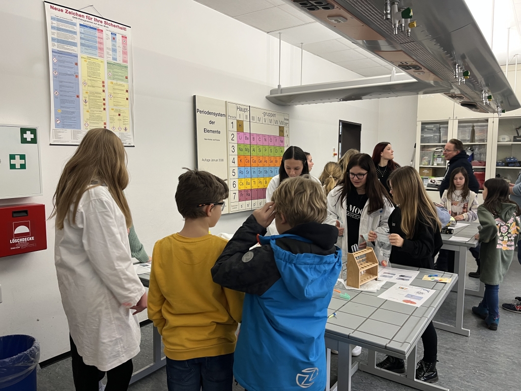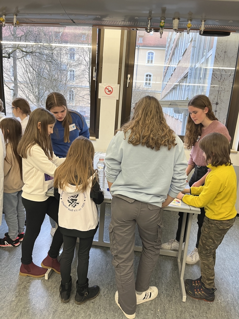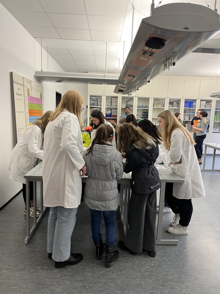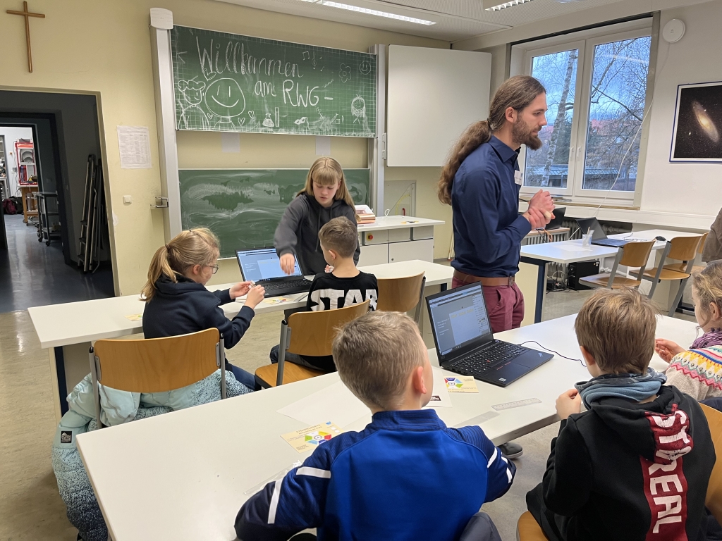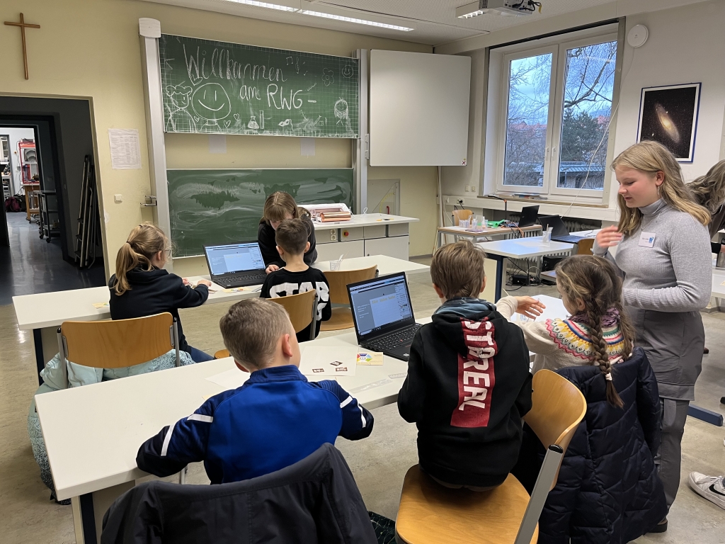 Damit dieser Tag so gut gelingen konnte, waren nicht nur viele Kolleginnen und Kollegen im Einsatz, die bei der Vorbereitung und Umsetzung der Workshops ihr bestes gaben, sondern auch unzählige Schülerinnen und Schüler aus den verschiedensten Jahrgangsstufen, die ganz unterschiedliche Aufgaben übernahmen. Die Kollegstufenschüler_innen kümmerten sich um das leibliche Wohl aller Beteiligten und boten eine riesige Auswahl an selbst gebackenen Kuchen und frisch gebrühten Kaffee an. Viele Mädels und Jungs aus den 9. und 10. Klassen betreuten die Kids bei ihren Workshops und führten sie durch unser Schulhaus. Außerdem waren auch viele unser Schülerinnen und Schüler als direkte Helfer bei den Workshops beteiligt und zeigten den Grundschülerinnen und Grundschüler stolz, was sie selbst am RWG in den Profilfächern erlernt haben.