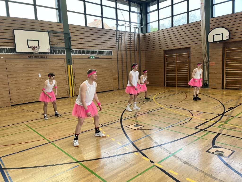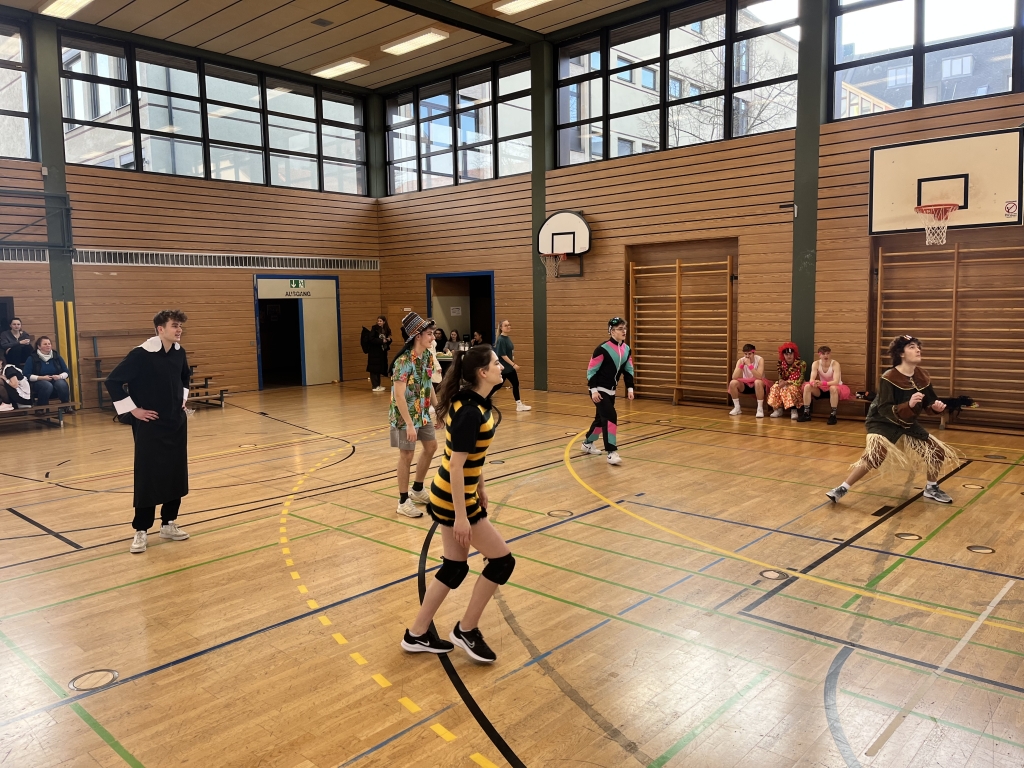 16 Teams hatten sich zum diesjährigen Turnier angemeldet und die Stimmung in der Turnhalle teilweise zum Überlaufen gebracht. Alle SchülerInnen von der 9. Klasse bis zur Q12 waren eingeladen, sich mit ihren Teams anzumelden und neben der sportlichen Krone auch um den Titel des besten Stimmungsteams zu kämpfen. Hierzu wurden kreative Kostüme getragen, ausgefallene Schlachtrufe kreiert und natürlich einfallsreiche Teamnamen erfunden. Die Q11 kümmerte sich mit leckerer Pizza und kühlen Getränken um das leibliche Wohl der SchülerInnen und die ZuschauerInnen wurden zusätzlich zu den teilweise hochklassigen Matches auch mit lässiger Stimmungsmusik bespaßt.