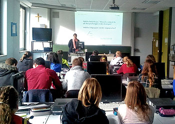 Nina Müller, Diplomdesignerin aus Bayreuth, erarbeitete gemeinsam mit den Schülern folgende Fragen: Was ist Werbung, welche Bedürfnisse werden durch Werbung angesprochen, was versteht man unter einer Zielgruppe und was wäre eigentlich, wenn es ab morgen keine Werbung mehr gäbe? Sehr informativ, und mit aufschlussreichem Bildmaterial untermalt, wurden die Schüler über das negative, aber auch positive der Werbung aufgeklärt. Anschließend erarbeiteten die Schüler das Thema sukzessive in Partner- und Gruppenarbeit und erhielten dazu Praxisbeispiele. Außerdem durften die Schüler auch „Hinter die Kulissen“ der Werbegestaltung blicken. Sehr spannend fanden sie auch die Erfahrungsberichte aus der Arbeitswelt der Werbefachfrau. Nina Müller berichtete über ihre Zusammenarbeit mit großen Kunden, wie z.B. O2 oder der Molkerei „Berchtesgadener Land“.