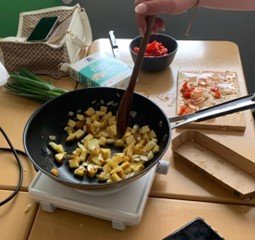 Unser erster Gang führte uns in den Neubau zu Herrn Knappes Projekt. Dieses bestand aus veganem Einkaufen, welches kaum schwieriger als Einkaufen mit tierischen Produkten war, aber vor allem länger gedauert hat. Anschließend gab es ein gemeinsames Kochen, das nach einem großen Spaß ausgesehen hat. Die Schüler*innen haben vegane Bolognese, veganes Rührei und verschiedenste Aufstriche zubereitet. Doch wie hat die vegane Speise überhaupt geschmeckt? Gut, aber natürlich anders, im positiven Sinne, kam die Rückmeldung von einer Schülerin. In einer weiteren Unterhaltung erfahren wir, wie individuell vegane Ernährung sein kann. Doch warum lebt man eigentlich vegan? Es gibt verschiedene Gründe, sagt die zuständige Lehrkraft. Natürlich wegen den Tieren, aber man kann durch veganes Leben auch Krankheiten (gar Krebs?) verhindern, da man sich genau mit den Inhalten eines Produkts beschäftigt.