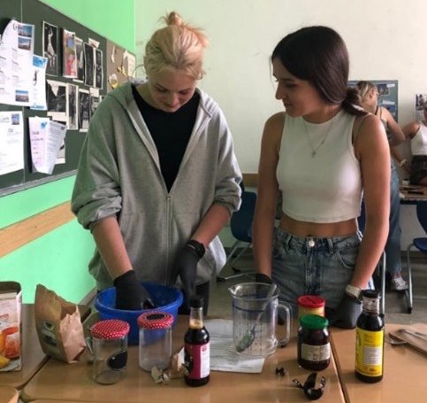 Als letztes haben wir einen Abstecher bei Frau Schwind und ihrer Chemieklasse gemacht. Die Schülerin, die wir interviewt haben, machte einen sehr motivierten Eindruck. Sie erzählte, dass sie Naturkosmetik möge und deshalb sich für dieses Projekt eingetragen habe. Sie sei für alles offen und begeistert von der Vielfalt dieses Workshops. Außerdem möge sie auch das Angebot und sei mit der Art der Durchführung sehr zufrieden.