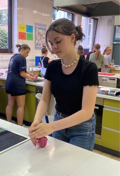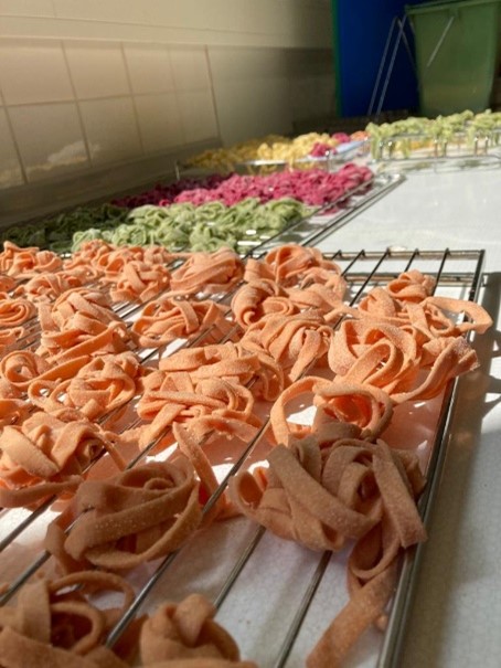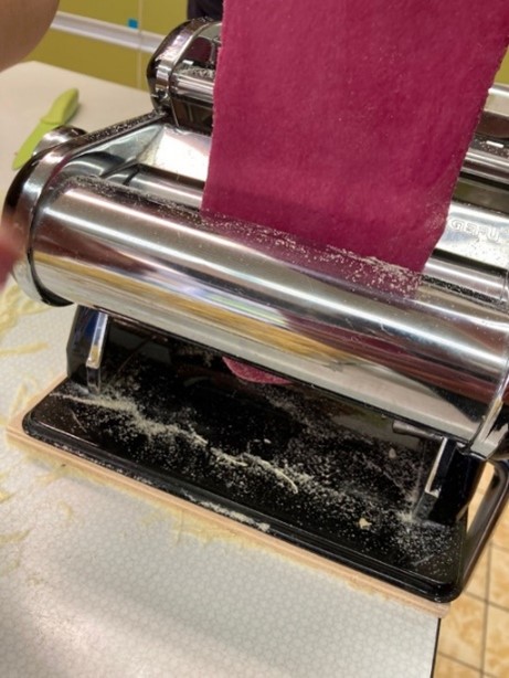 Anschließend ging es in die Schulküche, unserem zweiten Gang, in der wir eine angenehme Atmosphäre vorfinden konnten. Die Schüler hatten sehr viel Freude daran, bunte Nudeln natürlich herzustellen, da dies eine einmalige Chance war, selbst Nudeln anzufertigen. Mit viel Spaß färbten die Schüler*innen einen „normalen“ Nudelteig mit Tomatenmark, Spinat und roter Bete kunterbunt. Schön war zu sehen, dass die Leiterin dieses Projekts so erfreut über die Begeisterung der Teilnehmer*innen der 8. und 9. Klassen war. Das Endergebnis ließ sich auch sehen: Glückliche Lehrerin, glückliche Schüler und leckere Pasta!