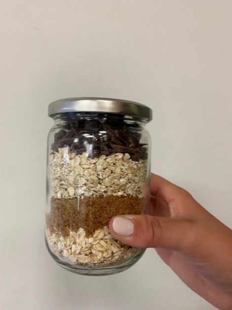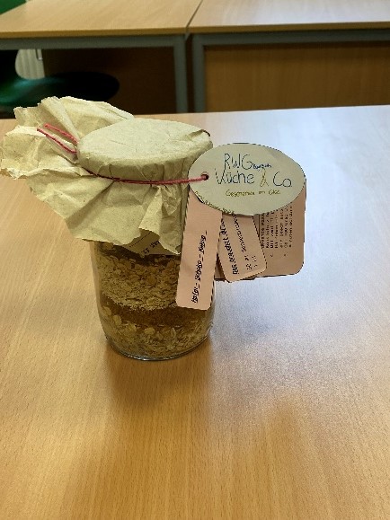 Danach ging es ab in den Schulkeller, wo die Schüler*innen bei Frau Schertel-Zeiske selbst Geschenke in recycelten Gläsern herstellen konnten. Bei diesen handelte es sich um verschiedene Backmischungen wie zum Beispiel für Hafer-Schoko-Kekse, Karottenkuchen und Vollkorn-Buttermilchbrote. Die Idee dahinter war, ausgedienten Gläsern einen neuen Zweck zu verleihen und dadurch ein schönes, selbstgemachtes Geschenk zu erschaffen. Besonders begeisterte die Schüler*innen, dass sie neue Rezepte und Wissen rund ums Backen kennenlernen konnten.