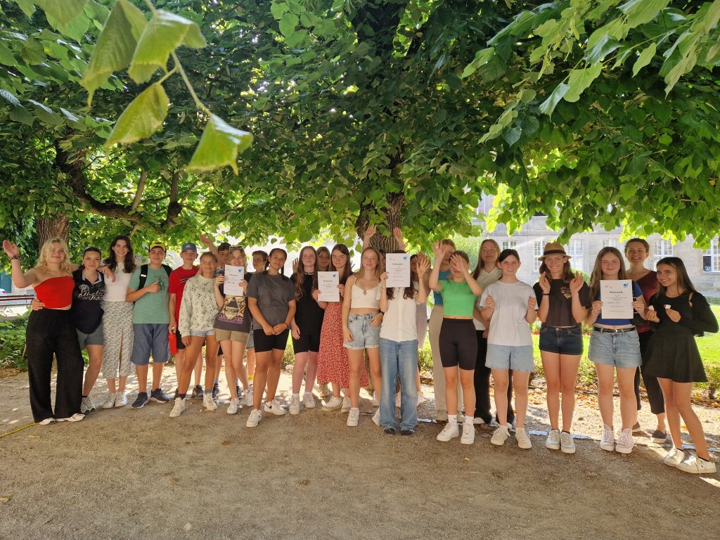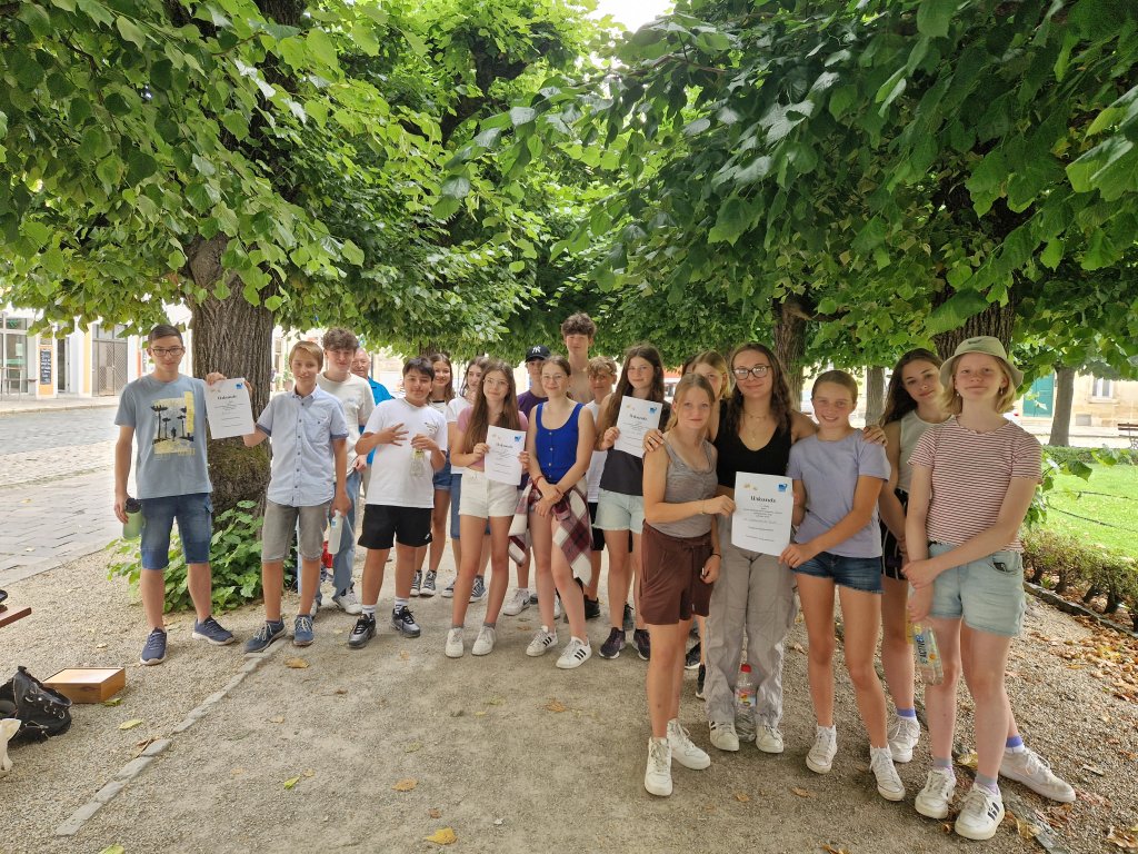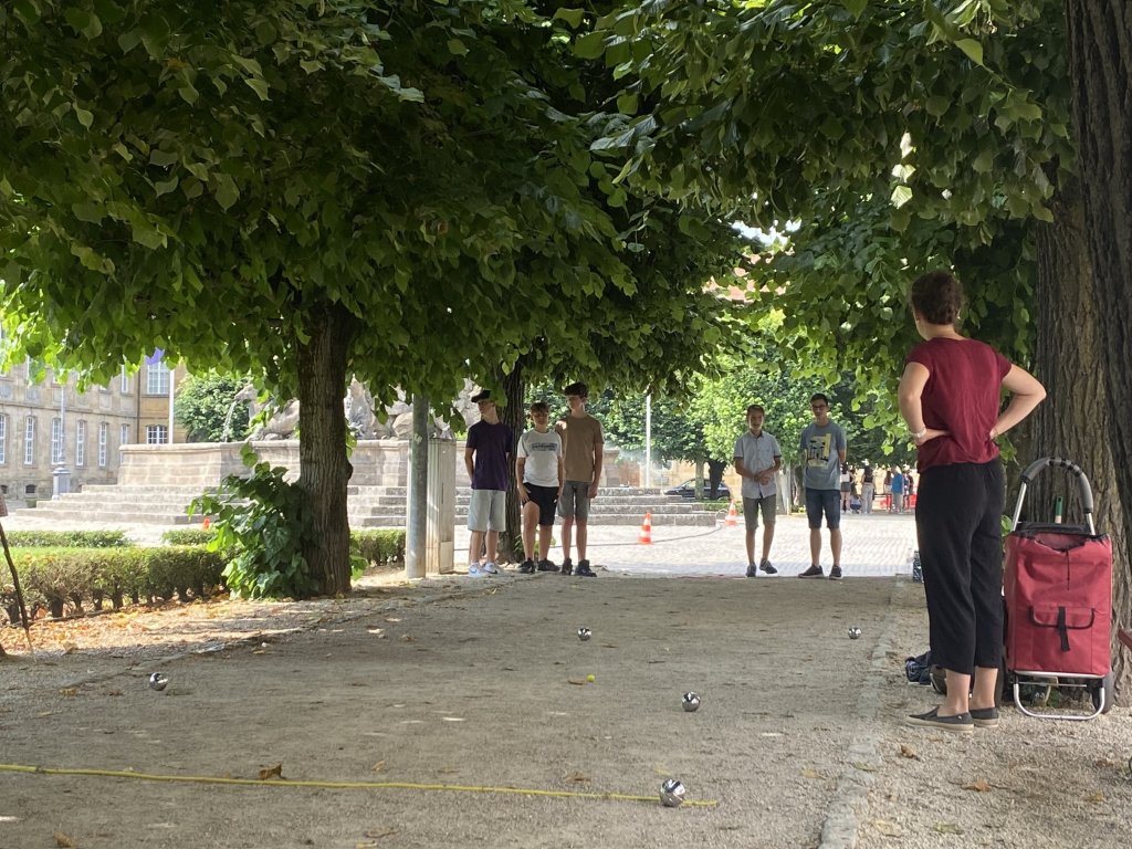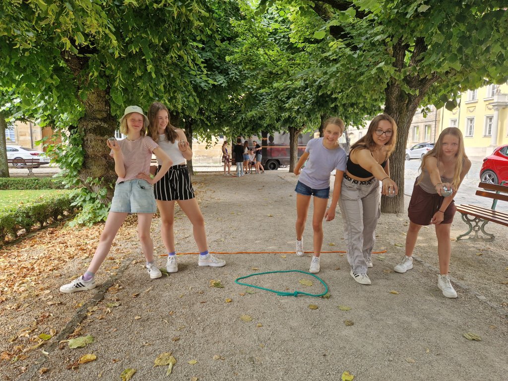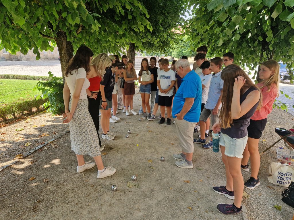 Das P-Seminar „deutsch-französischer Tag“ veranstaltete am 10. Juli 2023 einen kleinen Spieletag für die Französischlernenden der 7. Klassen am Neuen Schloss. Wir stellten den SchülerInnen gemeinsam mit unserem externen Partner Herr Lindner, der langjähriger und erfahrener Boulespieler ist, das französische Kugelspiel vor. Die SchülerInnen durften dann natürlich auch sofort selbst Boule spielen und wurden mit Urkunden und Preisen belohnt.