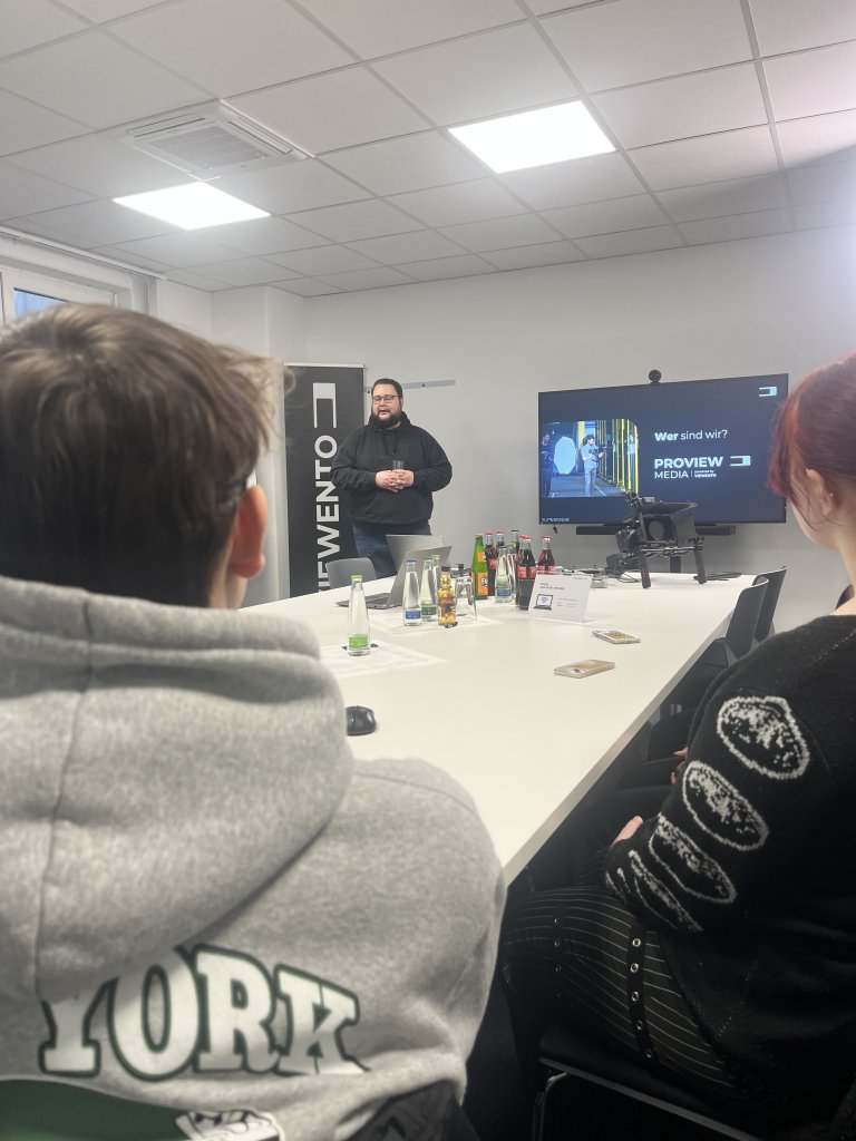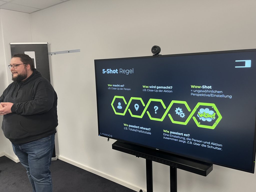 Zum zweiten Workshop mit dem Schwerpunkt „Kurzfilme“ wurde das Seminar in die Firmenräume von Viewento nach Bindlach eingeladen. Dort lieferte Florian, Head of Video & Foto der Tochterfirma Proview Media, zunächst die wichtigsten Infos zur sogenannten „5-Shot Regel“. Anhand beeindruckender Beispielfilme, die Viewento in letzter Zeit für deren Kunden produziert hatte, wurde den SeminarteilnehmerInnen nochmals deutlich gemacht, worauf es bei Kurzfilmen wirklich ankommt, um die gewollte Message rüberzubringen. Danach ging es auch direkt wieder in die Praxis nach dem Motto „Learning by Doing“. Die vor Ort erstellten Kurzfilme wurden dann sogar noch mit einem kostenlos zur Verfügung gestellten Schnittprogramm so nachbearbeitet, dass die SchülerInnen selbst erstaunt darüber waren, wie kleine Effekte der 5-Shot Regel die eigenen Kurzfilme aufwerten.
