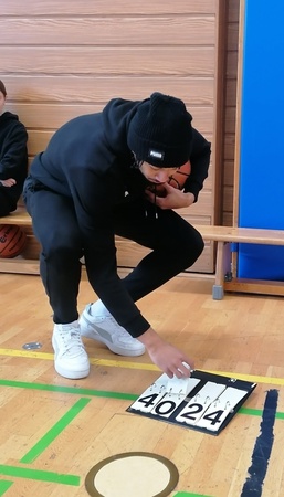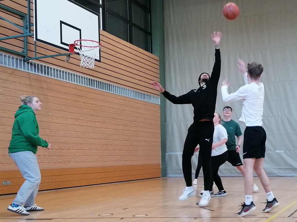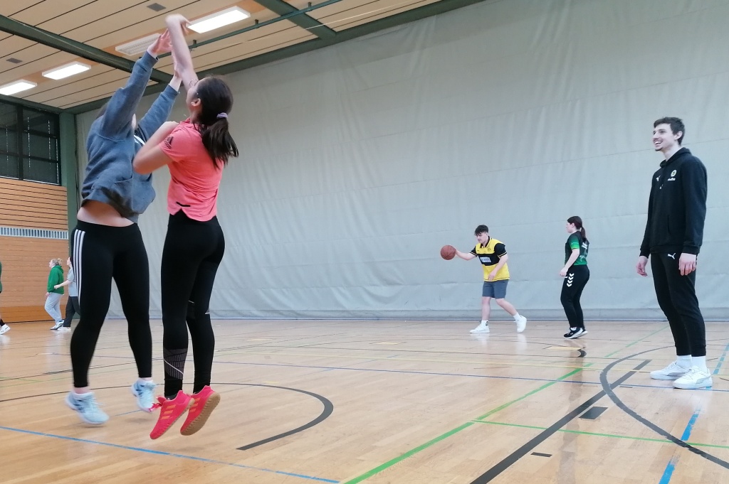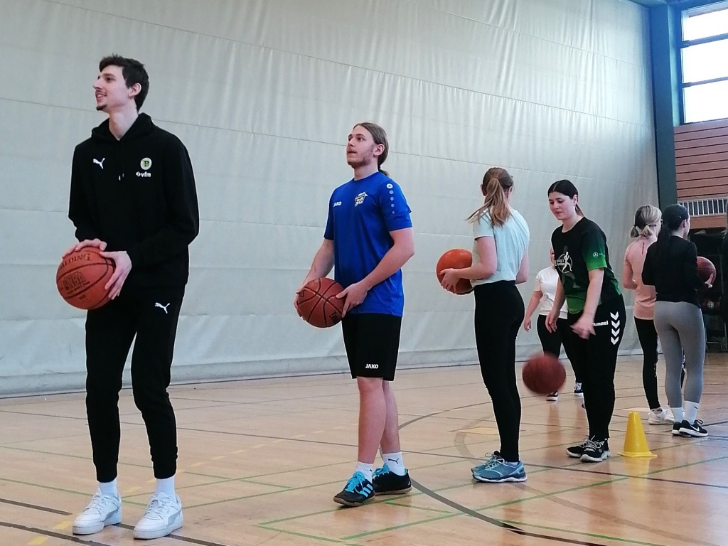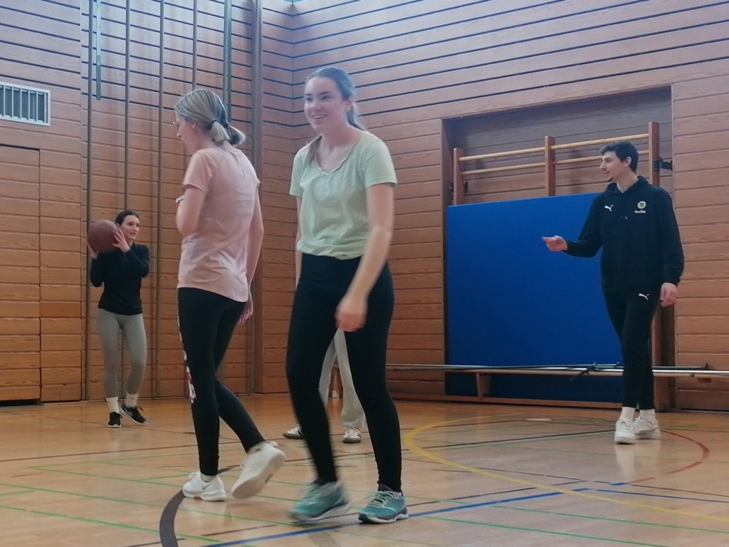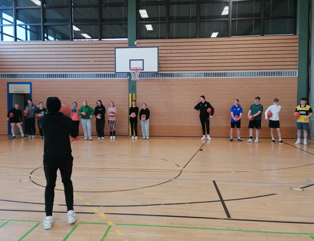Zwei besondere Highlight erwartete die Schülerinnen und Schüler des Q12 Basketballkurses. Am Wochenende waren wir in der Oberfrankenhalle zu Gast, um das Team des BBC beim Heimspiel gegen die Fraport Skyliners anzufeuern. Und am Tag darauf besuchten uns mit Selim Fofana und Moritz Plescher zwei Leistungsträger des Teams im Unterricht. In unserer Halle versprühten sie einen Hauch von 2. Basketball-Bundesliga ProA Atmosphäre. Die beiden gut gelaunten Sportler waren für jeden Spaß zu haben, traten in unterschiedlichen Wettkämpfen gegen unsere Schülerinnen und Schüler an und gaben viele nützliche Tipps zum Umgang mit dem Ball.