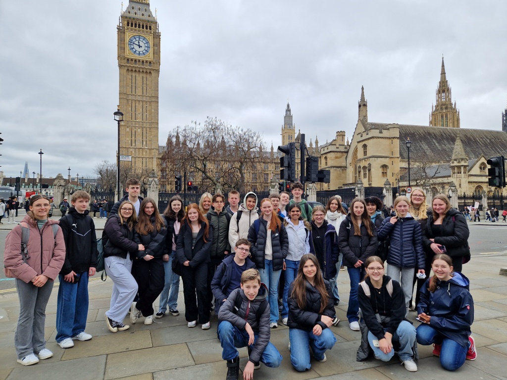 Am Dienstag stand eines der Highlights auf dem Programm: ein Tagesausflug nach London. Das Besondere an diesem Ausflug war für uns, dass unsere Austauschpartnerinnen und -partner uns begleiteten. So hatten wir alle die Möglichkeit, die Stadt gemeinsam zu erkunden und Erinnerungen mit unseren Austauschpartnerinnen und -partnern zu schaffen. Am Vormittag machten wir eine walking tour und konnten den berühmten Trafalgar Square, 10 Downing Street, Big Ben, die Houses of Parliament, Westminster Abbey und den Buckingham Palace sehen. Am Buckingham Palace erlebten wir wohl die größte Überraschung: Wir haben tatsächlich King Charles gesehen, als er den Palast verlassen hat. Manchmal muss man eben zur richtigen Zeit, am richtigen Ort sein 😉