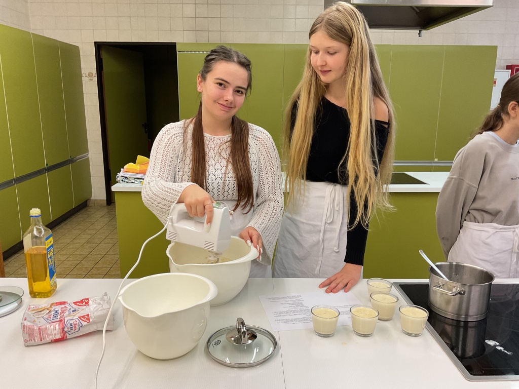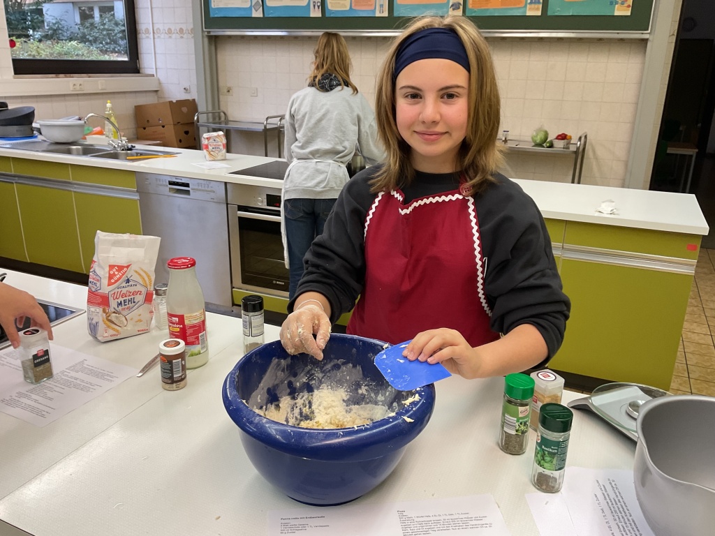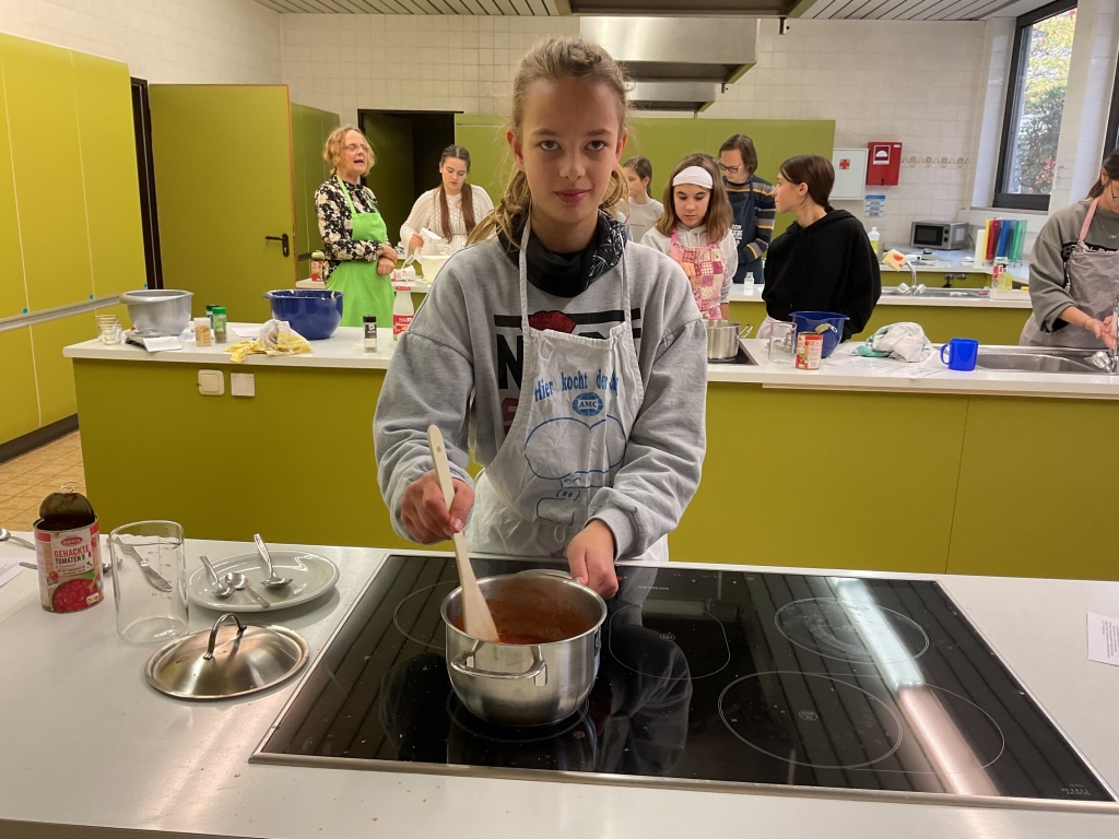Beim Betreten der Schulküche hört man Stimmengewirr, Lachen und es steigt der verführerische Geruch von Kürbissuppe in die Nase. Diese wird heute von den Teilnehmern der Koch-AG unter Leitung von Frau Schwind zubereitet. Außerdem steht noch Kaiserschmarrn mit Apfelkompott auf der Speisekarte. Die Äpfel stammen aus dem Garten von Frau Schwind, der Kürbis aus einer ortsansässigen Gärtnerei und die Eier aus Freilandhaltung aus der Region. Nachhaltigkeit ist der Hobbyköchin sehr wichtig (die Umweltwoche steht bald vor der Tür!!!!). Die Teilnehmer konnten fünf Kochwünsche zu Beginn des Kurses angeben. Diese werden laut Frau Schwind nach Zeitbedarf, Jahreszeit und Schwierigkeitsgrad eingeordnet. Zudem lernt man den Umgang mit unterschiedlichen Lebensmitteln, diversen Küchengeräten sowie den Aspekt der Hygiene beim Kochen. Eine Wiederholungstäterin berichtet uns begeistert über den tollen Zusammenhalt der Gruppe vom Vorbereiten der Zutaten bis hin zum Kochen, ja sogar bis zum Abwasch des Geschirrs. Frau Schwind, die es in ihrer Freizeit liebt, zu kochen und zu backen, hat in diesem Schuljahr die Leitung der AG übernommen. Sie ist der Meinung, dass jeder kochen lernen sollte, damit nicht nur Döner & Co. auf dem Speiseplan stehen.