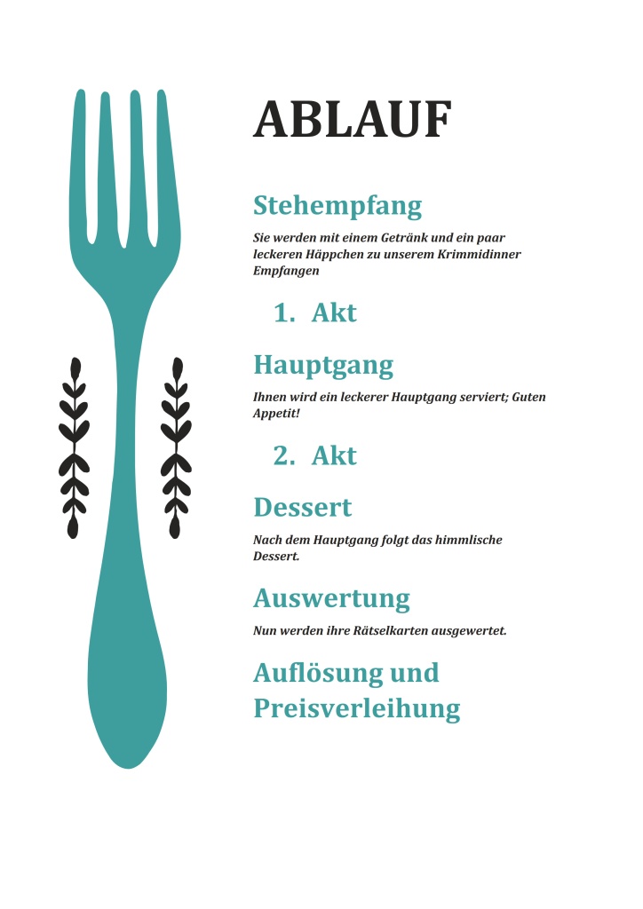 Beim Hauptgang werden eine vegetarische und eine fleischhaltige Variante angeboten. Bitte geben Sie bei der Reservierung an, welche Variante Sie wählen, welche Anzahl an Karten Sie gerne hätten und an welchem Tag Sie den „Mord zum Hauptgang“ besuchen wollen. Ferner gibt es Laufkarten.