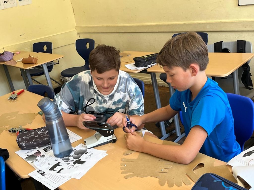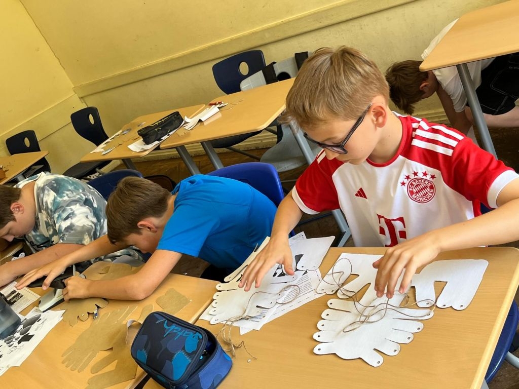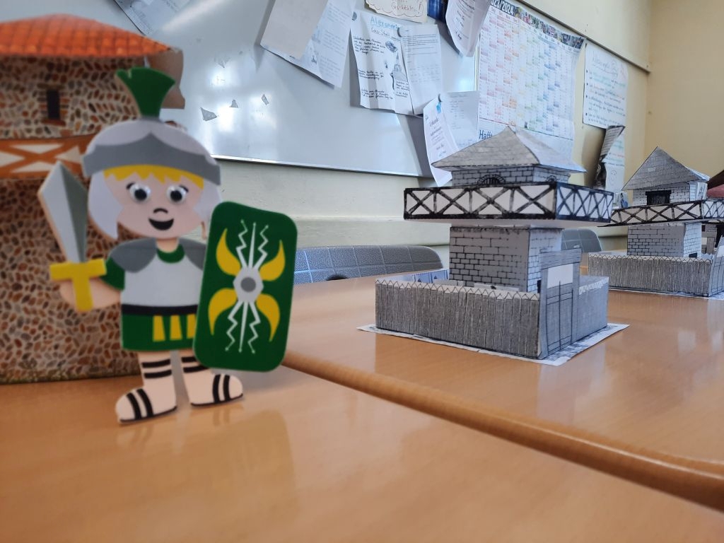 Im Anschluss wurden die Schüler/-innen dann selbst tätig und machten sich ans tüchtige Basteln, indem einerseits der typische römische Wachturm nachgebaut wurde, der sich von Ortschaft zu Ortschaft durch das Gelände zog und die römischen Soldaten untereinander in Kontakt stehen ließ.