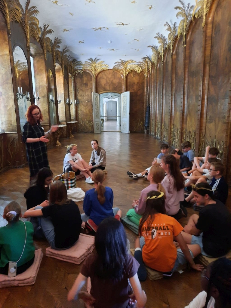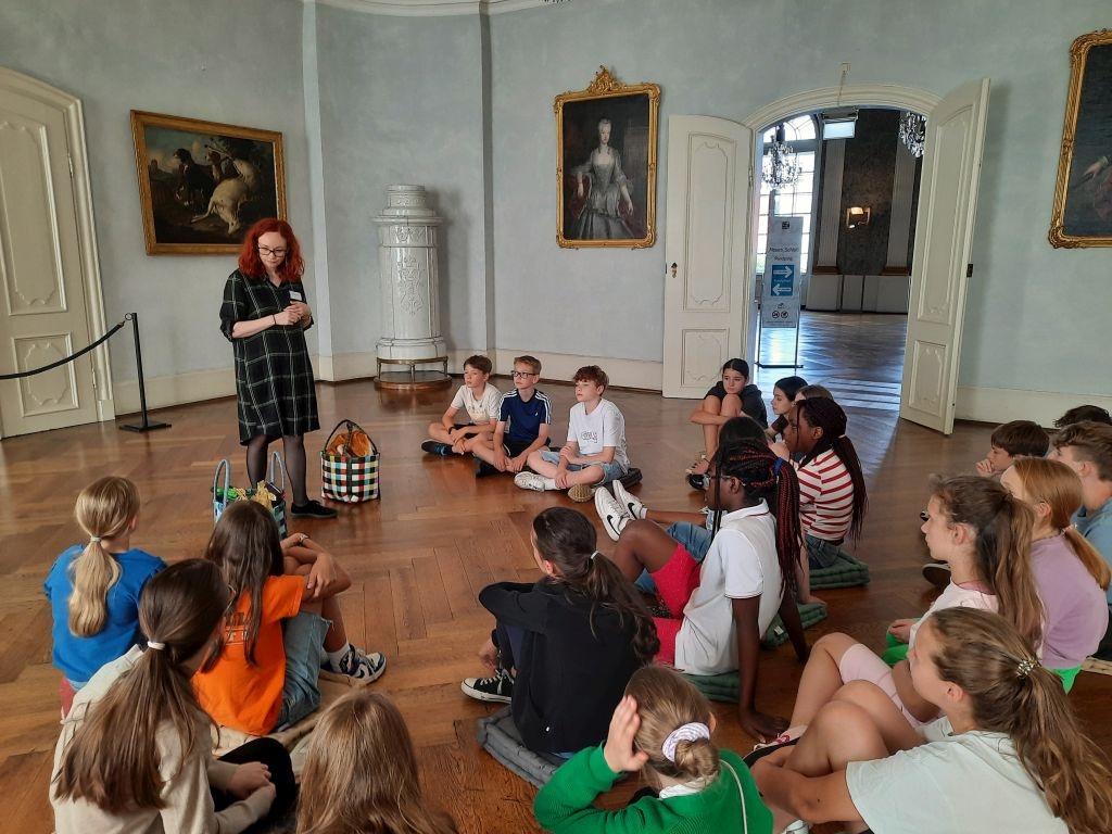 Unter dem Titel ‚Helden, Götter, Geister‘ durften die Sechstklässler/-innen an ihrem letzten Tag der jeweils halben Schulwoche eine Führung im Neuen Schloss in Bayreuth erleben, das sich bekanntermaßen in unmittelbarer Nähe zum RWG befindet. Hierbei ging es u.a. um sagenhafte Inhalte antik-römischer Mythen und Gestalten, wie sie u.a. für das Selbstverständnis der Römer von wichtiger Bedeutung waren und bis in die Neuzeit immer wieder auch von anderen europäischen Kulturen tradiert wurden. So gab es in etlichen Räumen des Schlosses die beeindruckend kunstvolle Raumdekoration, Wandmalereien u.v.m. zu bestaunen, wobei anhand der inhaltlichen Gestaltung immer wieder Parallelen zu antiken Mythen gezogen werden konnten.
