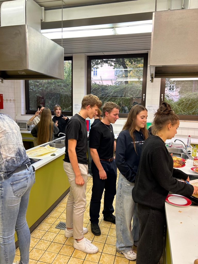 Am Mittwoch besuchten die Gäste den Unterricht und nahmen am späten Vormittag an der gemeinsamen Sprachanimation in der Aula und auf dem Pausenhof teil. So konnten erste Sprachbarrieren abgebaut werden. Beim geselligen Beisammensein am Abend in der Schulküche wurde beim Pizzaessen einiges vom Gelernten angewendet und man verstand sich schon gut.