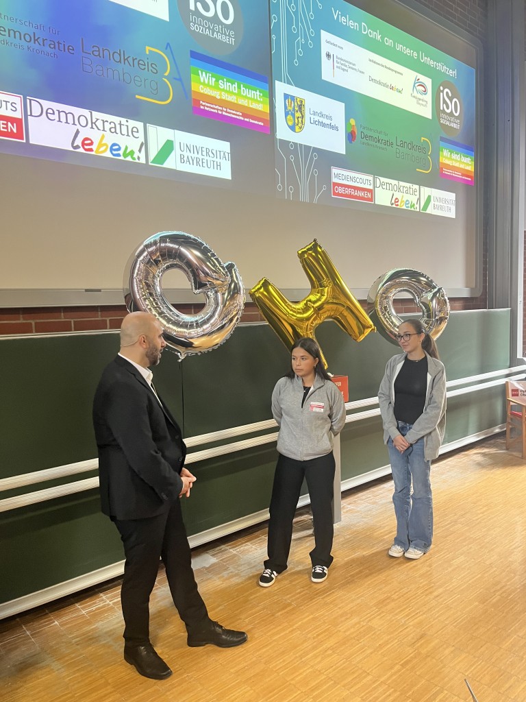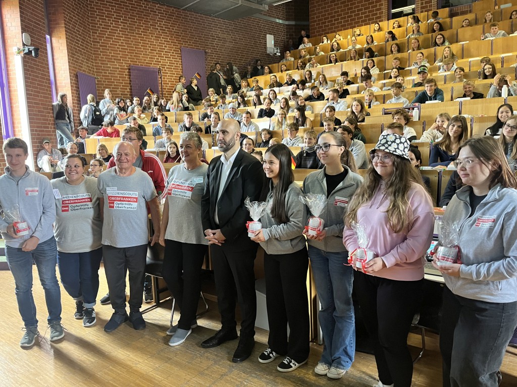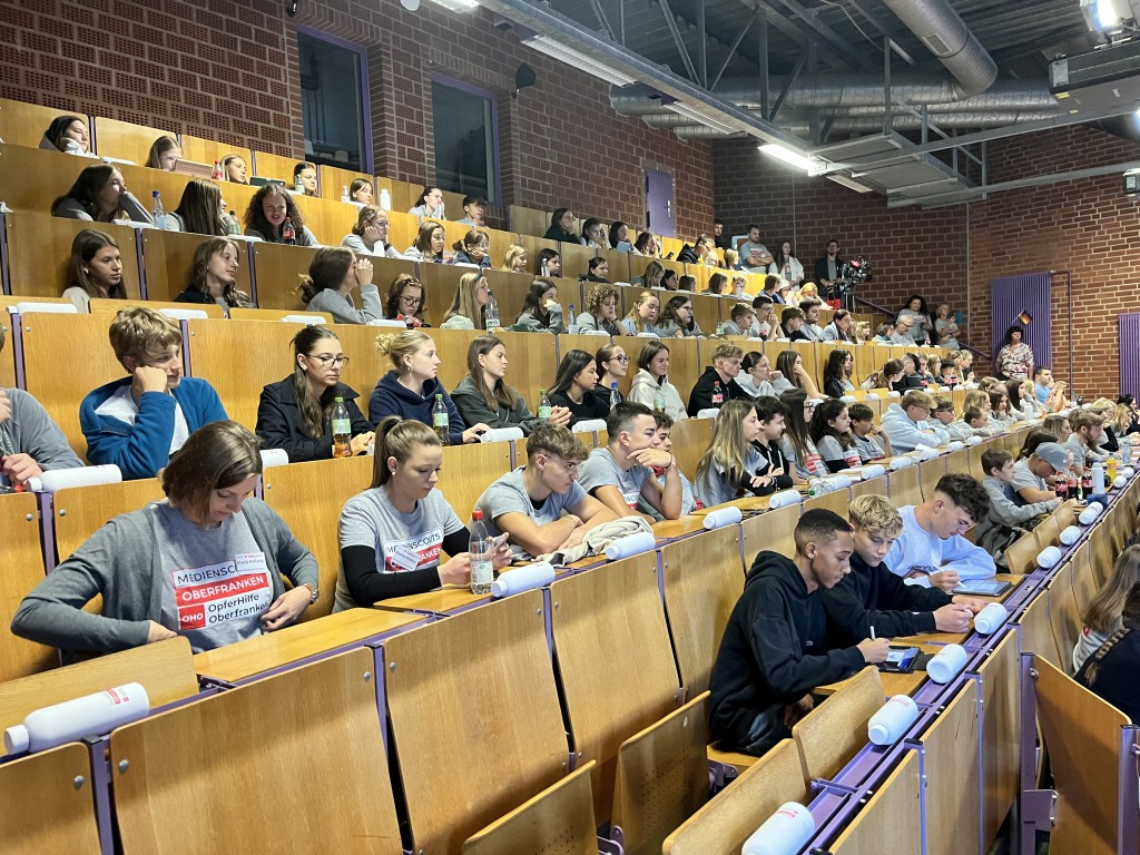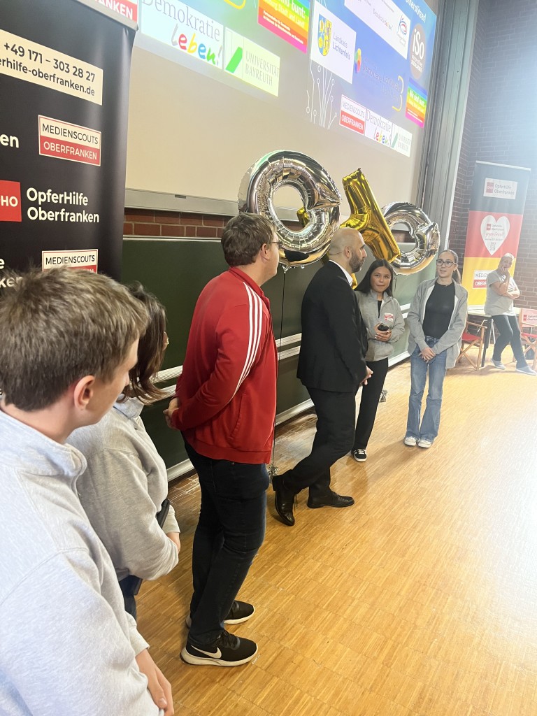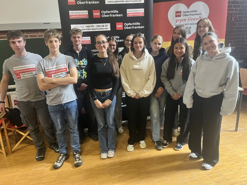 Unter den insgesamt 300 Teilnehmerinnen und Teilnehmern am Ausbildungstag für die Medienscouts in Oberfranken waren auch 12 Schülerinnen und Schüler des RWG. Die Schirmherrschaft für diesen Event übernahm der Bezirkstagspräsident Henry Schramm, der die Veranstaltung mit anerkennenden Grußworten eröffnete. Auch viele weitere bedeutende Persönlichkeiten aus Politik, Bildung und dem Polizeipräsidium Oberfranken drückten mit Reden und durch deren Anwesenheit ihre Anerkennung für die Arbeit der Medienscouts in Oberfranken aus. Darunter der Oberbürgermeister der Stadt Bayreuth Thomas Ebersberger, eine Vertreterin der Kultusministerin, der Kreisrat Manfred Neumeister sowie die Leiterin der Polizeiinspektion Bayreuth-Stadt, Christine Götschel.