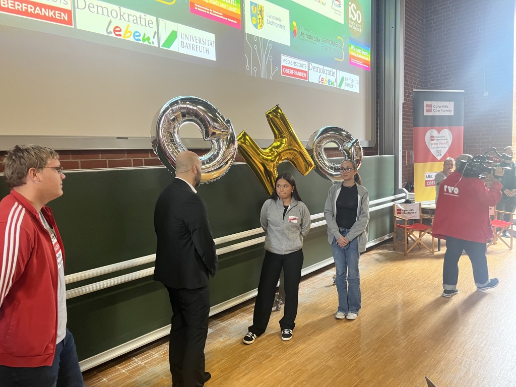 Zur Auflockerung zwischen den einzelnen Arbeitsphasen trug das Fast Forward Theatre bei. Die Künstler setzten durch kreative Einlagen treffende Impulse zum Thema Demokratieverständis und sorgten für eine positive Stimmung. Um das leibliche Wohl der Medienscouts und deren Betreuer sorgte sich die Opferhilfe Oberfranken mit einer riesigen Candybar und einem leckeren Kuchenbuffet. Außerdem wurden alle Teilnehmerinnen und Teilnehmer zum Mittagessen in die Mensa der Uni Bayreuth eingeladen und konnten sich den ganzen Tag an der kostenlosen Getränkebar versorgen. Vielen Dank für euer tolles Engagement!