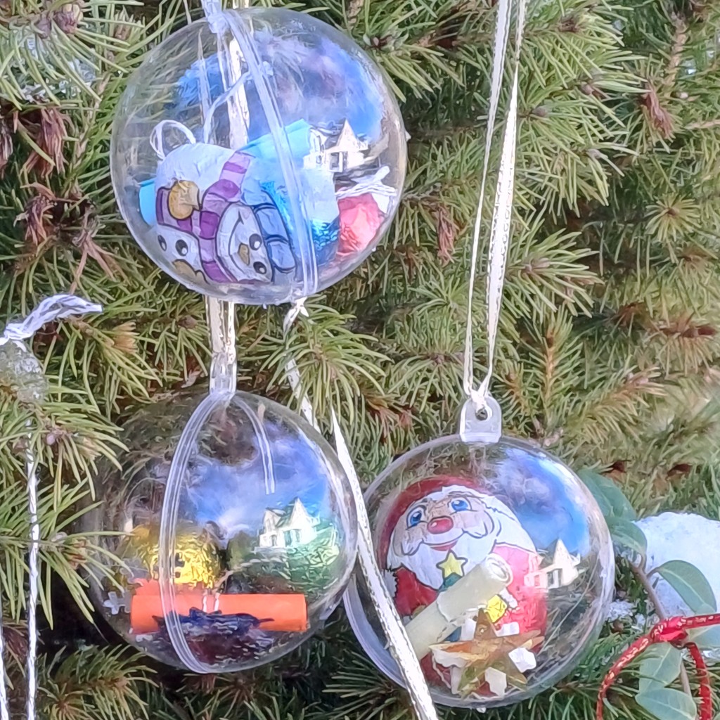 Diese kleinen Kugeln eignen sich hervorragend als Christbaumschmuck, Geschenkanhänger oder auch als kleines Mitbringsel bei einer Einladung. Es gibt sie mit Bändern in verschiedenen Farben und unterschiedlichen Füllungen. Die Weihnachtskugeln können jetzt im Advent im Religionsunterricht oder auch montags, mittwochs und freitags in der großen Pause beim Werteteam der SMV in der unteren Pausenhalle für 1Euro pro Stück erworben werden.