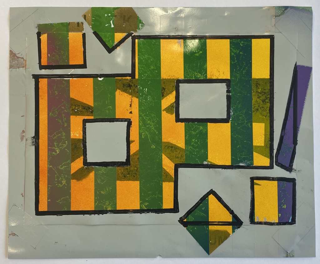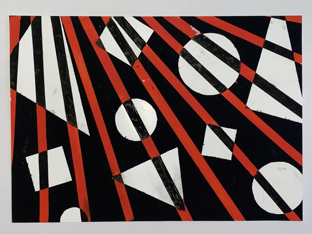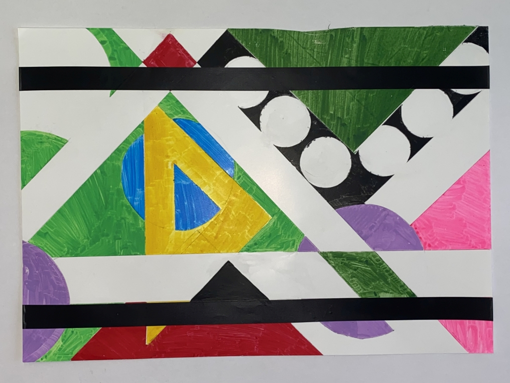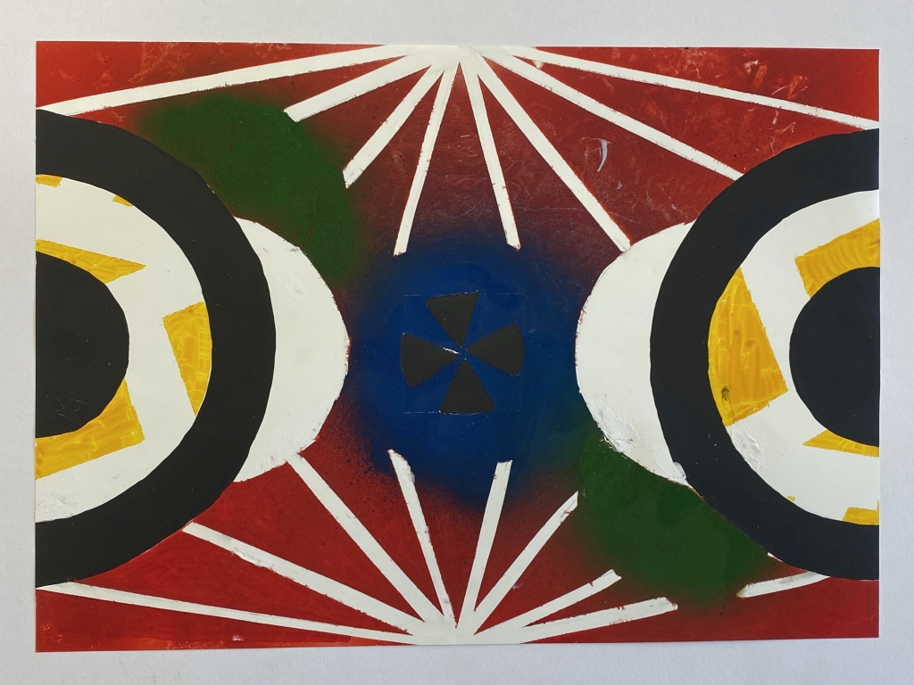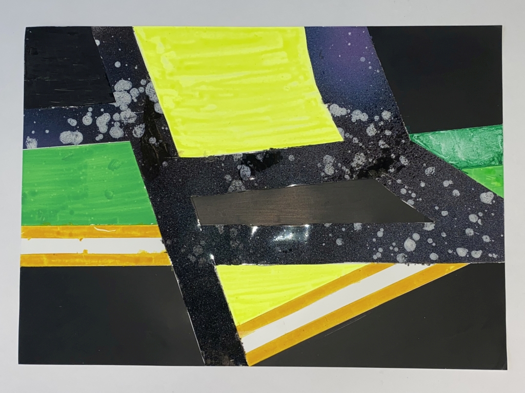 Sprühlack, Klebebänder und Acrylfarbe bilden das Material für diese Abstraktionen. Die Gestaltgesetze sind Grundlage der Planung, dann wird experimentiert und improvisiert. (Jahrgangsstufe 10)