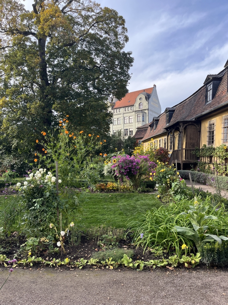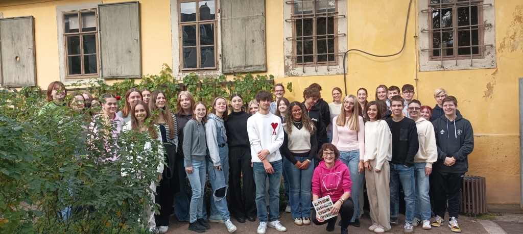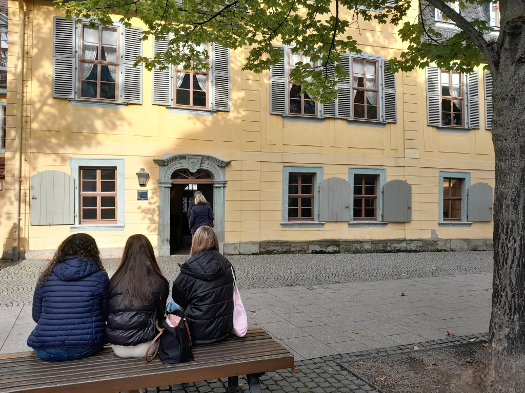 Strahlender Sonnenschein und angenehm warme Temperaturen begrüßten die Schülerinnen und Schüler der Q12 und zwei Lehrerinnen, als sie am Freitag, den 18. Oktober, noch etwas verschlafen aus dem Bus stiegen. Vom modernen Atrium aus ging es direkt in die historische Altstadt und dort zum berühmten Haus am Frauenplan. Goethes Wohnhaus, von dem der Dichter bereits zu Lebzeiten Pläne für eine spätere Nutzung als Museum gemacht hatte, konnte mit einem Audioguide individuell erkundet werden. Besonders beeindruckten dabei die bunten Farben in den großen Räumen sowie die vielen Kunstgegenstände und Sammlungen, welche die mannigfaltigen Interessen Goethes spiegeln. Das schöne Wetter lud im Anschluss daran noch zu einem längeren Aufenthalt im Garten des Hauses ein.