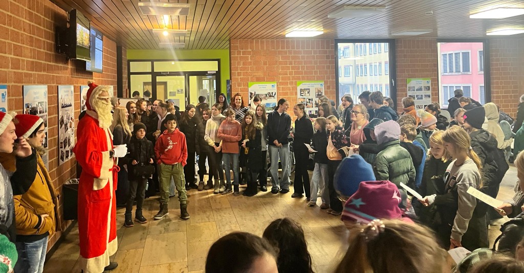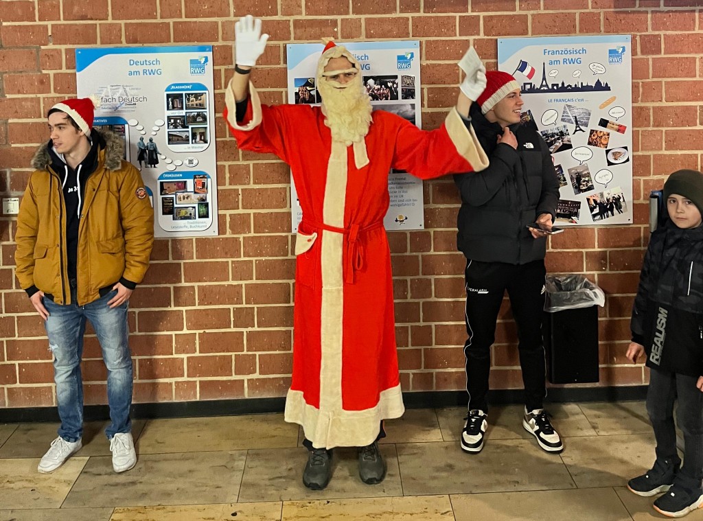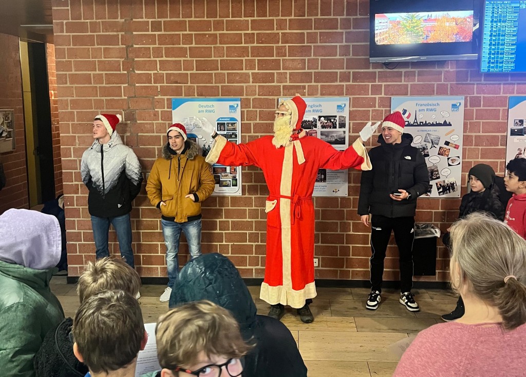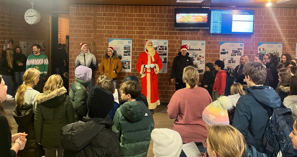 Alle Jahre wieder besucht der Weihnachtsmann das RWG, um die Schulfamilie mit weihnachtlichem Gesang in die Weihnachtszeit zu verabschieden. Unterstützt von einem großen Chor, bestehend aus Schülerinnen, Schülern und Lehrkräften, ertönten Weihnachtsklänge durch die Gänge des Hauses.