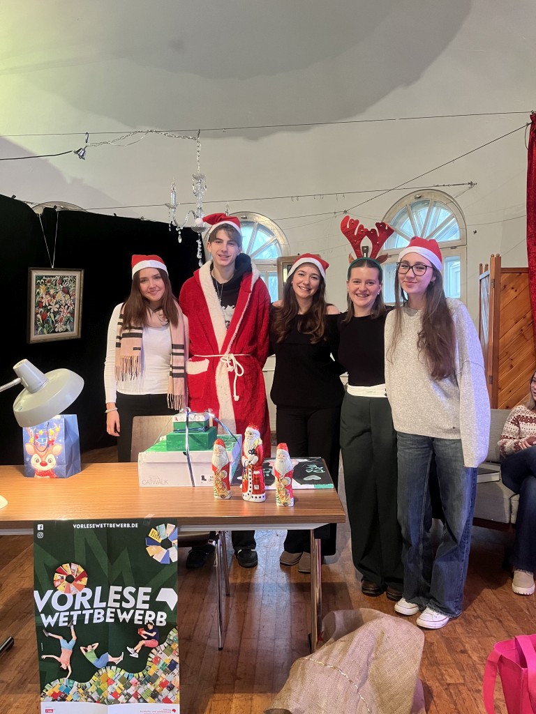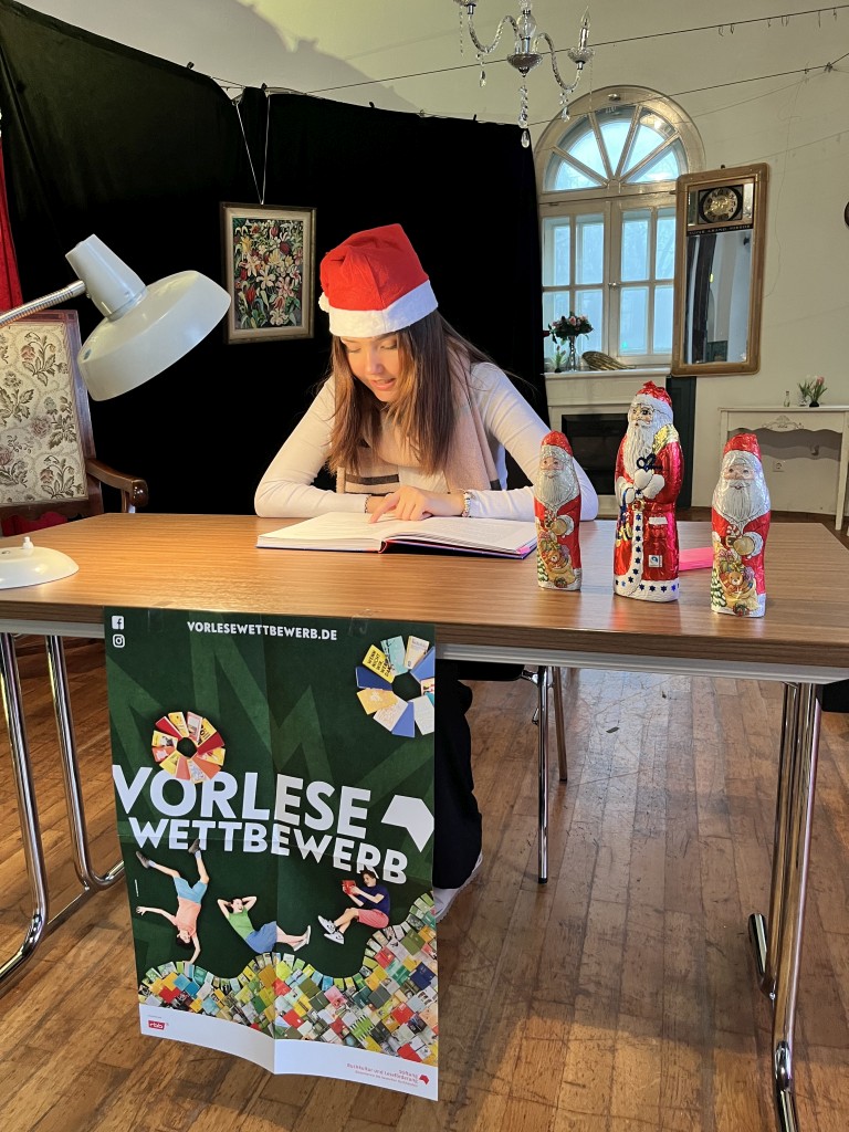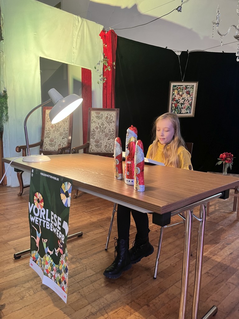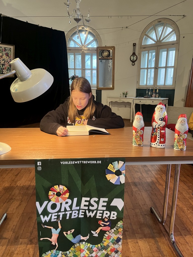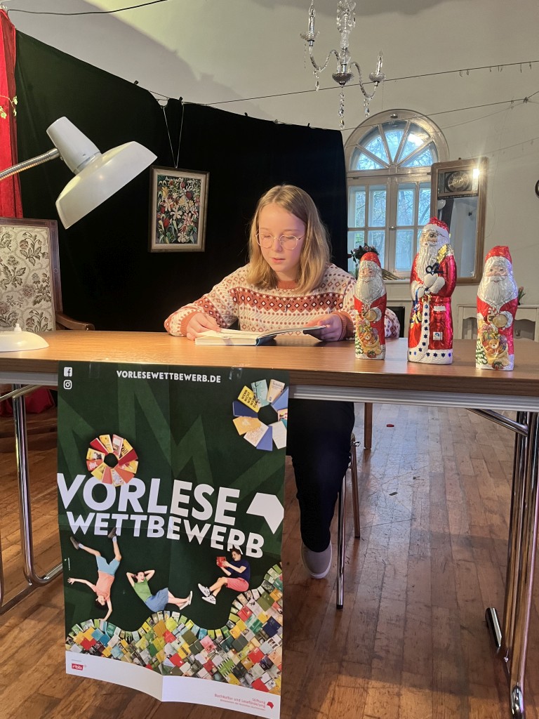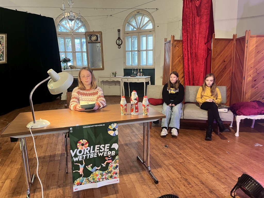 Nach einer kleinen Pause, während der sich die Jury zur Beratung zurückgezogen hatte, ging es weiter. Der Nikolaus schlich durch die Tür herein und verteilte Geschenke und kleine Schokoladennikoläuse. In der zweiten Runde mussten nun alle Wettbewerbsteilnehmerinnen aus einem unbekannten Buch vorlesen. Diesmal wurde die Reihenfolge umgekehrt und Sophia startete. Danach kam Zoey und zum Schluss Johanna. Da die Vorleserinnen den Text nicht zuhause vorbereitet hatten, waren die Vorträge bei allen etwas weniger flüssig.
