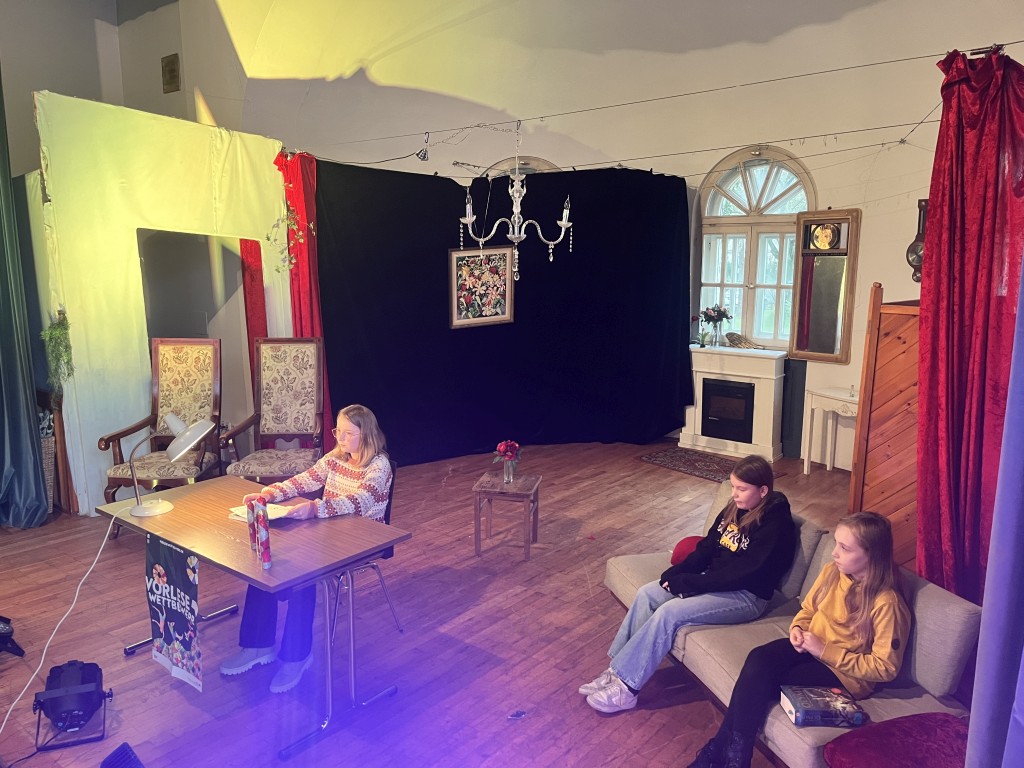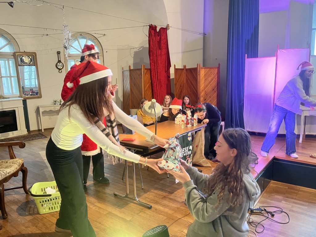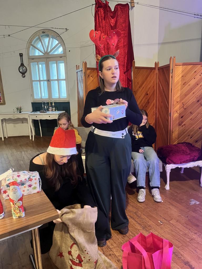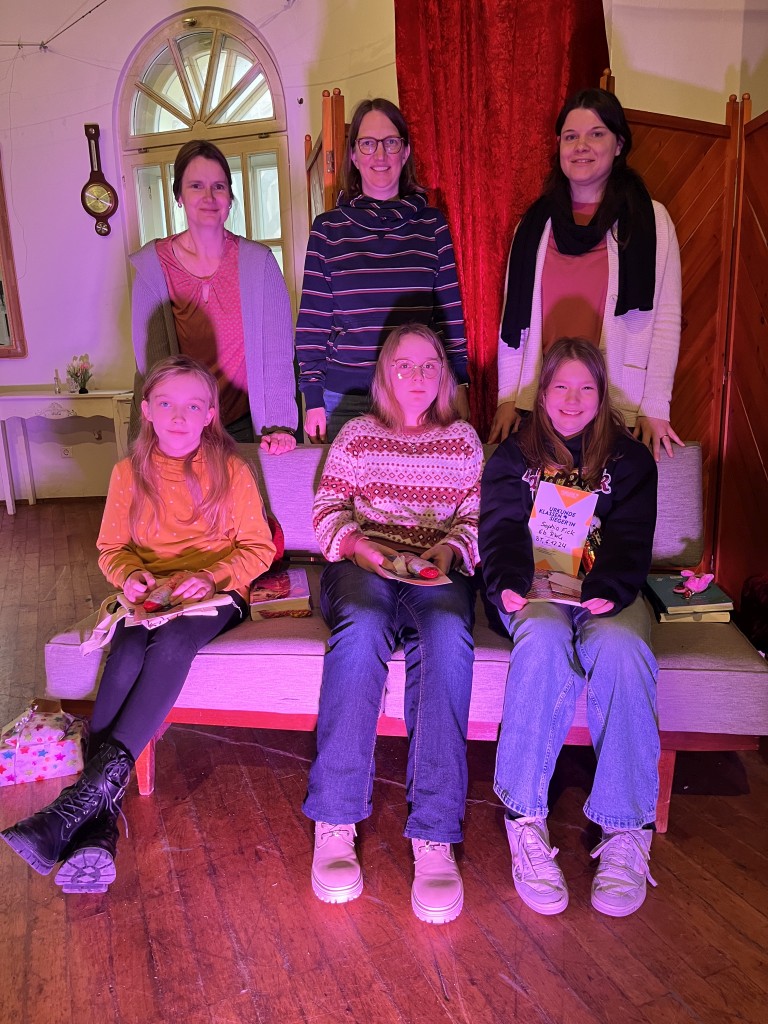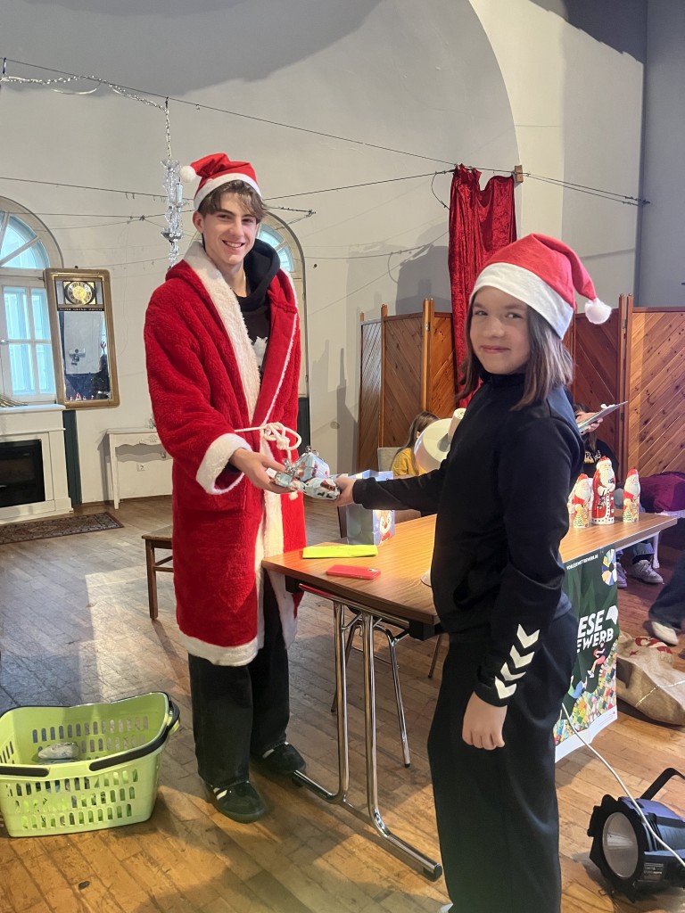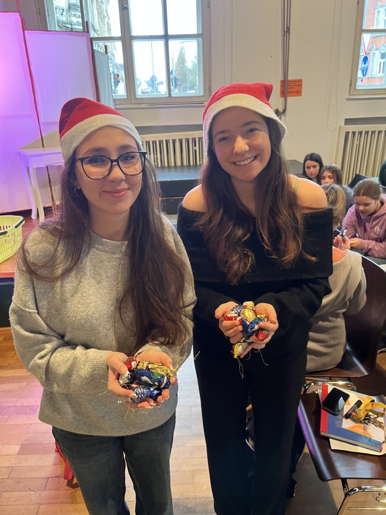 Nach einer kleinen Pause, während der sich die Jury zur Beratung zurückgezogen hatte, ging es weiter. Der Nikolaus schlich durch die Tür herein und verteilte Geschenke und kleine Schokoladennikoläuse. In der zweiten Runde mussten nun alle Wettbewerbsteilnehmerinnen aus einem unbekannten Buch vorlesen. Diesmal wurde die Reihenfolge umgekehrt und Sophia startete. Danach kam Zoey und zum Schluss Johanna. Da die Vorleserinnen den Text nicht zuhause vorbereitet hatten, waren die Vorträge bei allen etwas weniger flüssig.