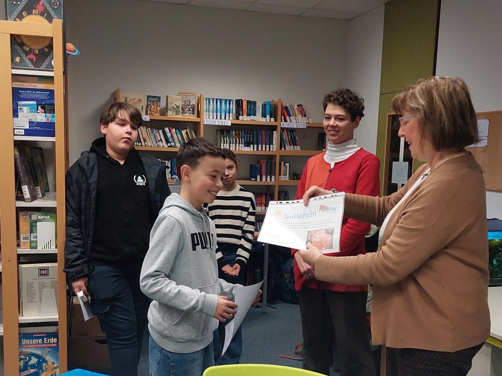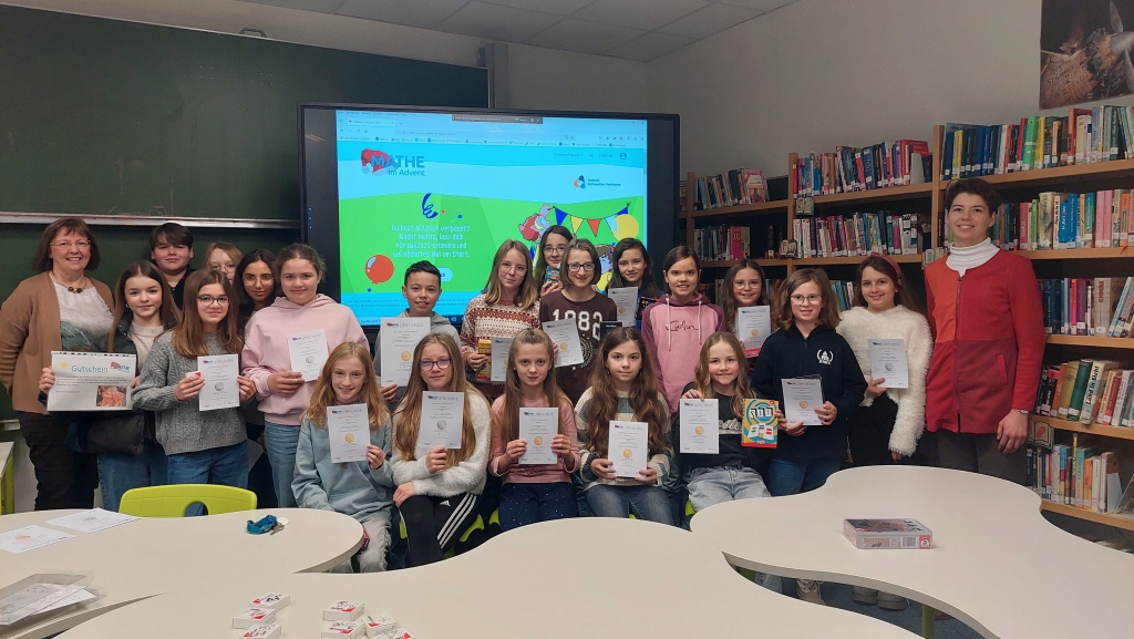 „Zurück zu den Wurzeln“ hieß diesmal das Motto des mathematischen Adventskalenders. 24 kreative Rätsel und Probleme aus der Welt der Weihnachtswichtel warteten im Dezember 2024 auf die Schülerinnen und Schüler. Die besonders Erfolgreichen unter Ihnen beglückwünschte Frau Graf bei der Siegerehrung am 15.01.2025 persönlich und händigte elf Goldmedaillen und elf Silbermedaillen aus. Beste Klasse wurde die 6a, die es gemeinsam auf 275 richtige Lösungen brachte. Frau Feldmüller, die sich um die Organisation kümmert, freute sich besonders über die vielen Medaillen in diesem Jahr.