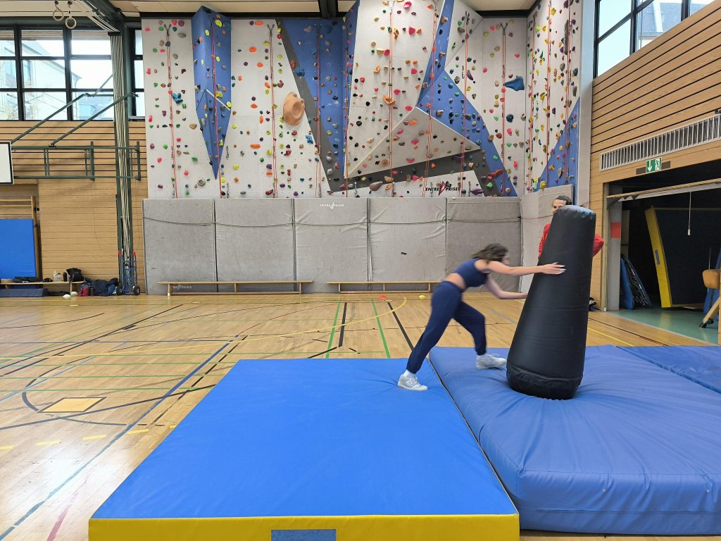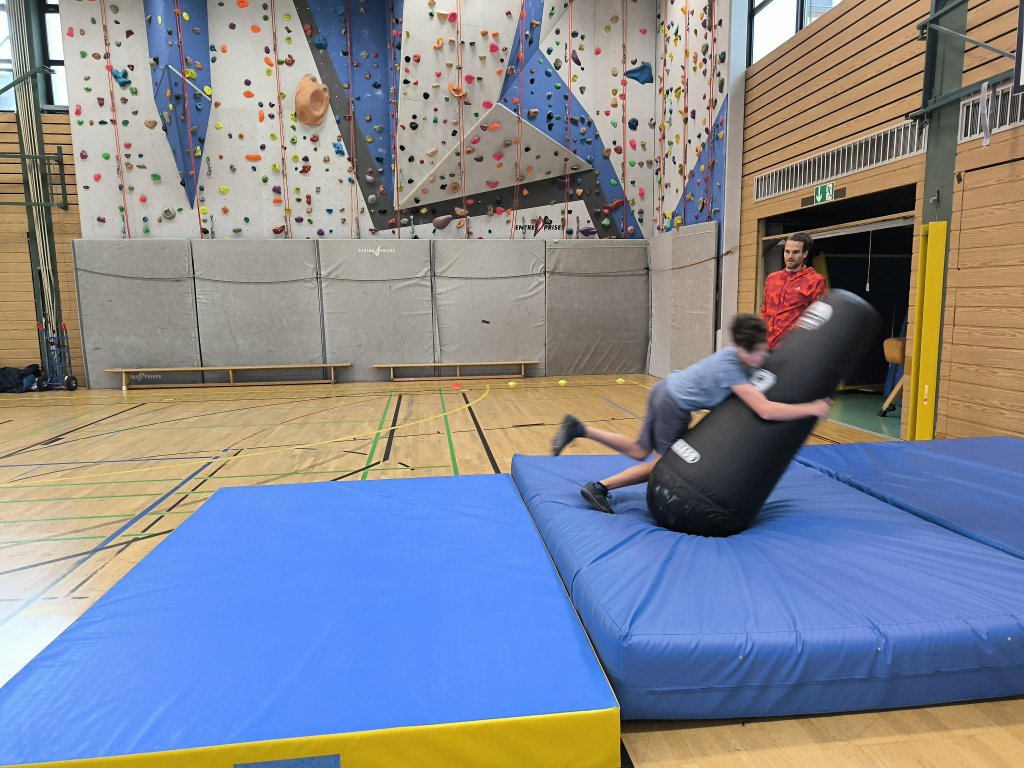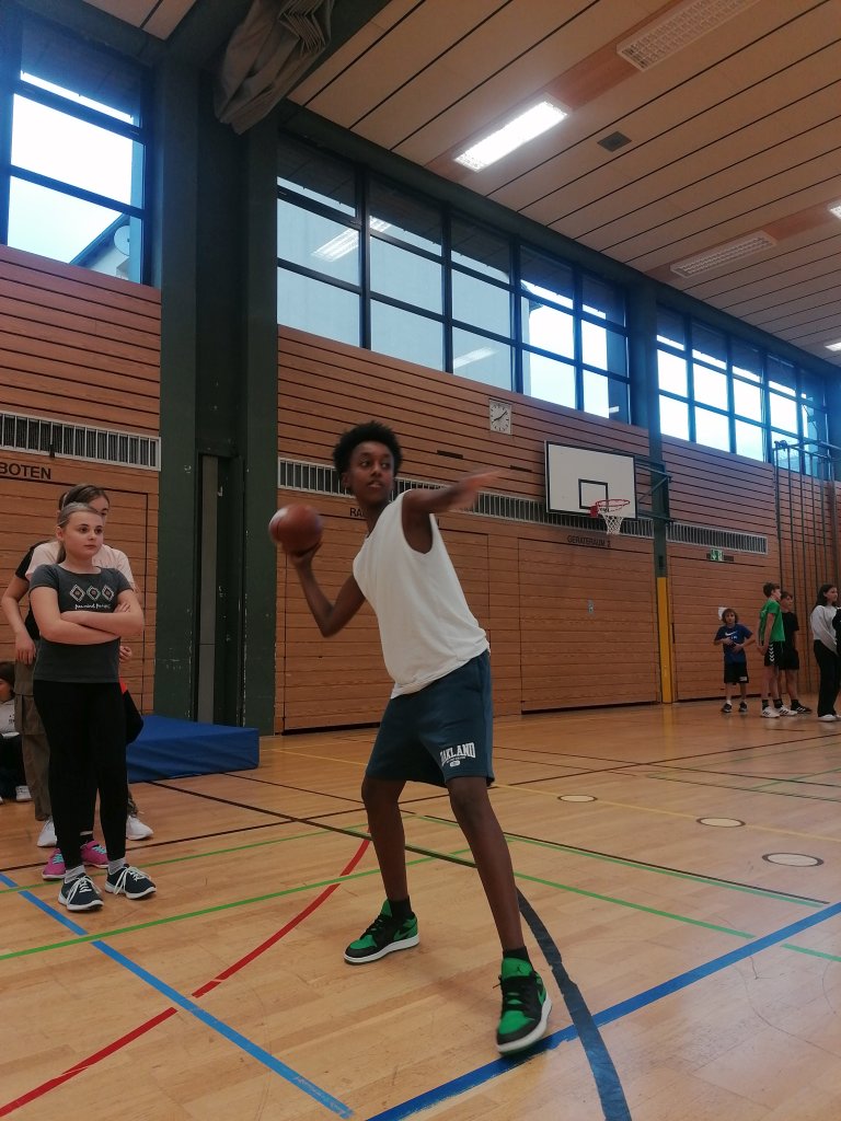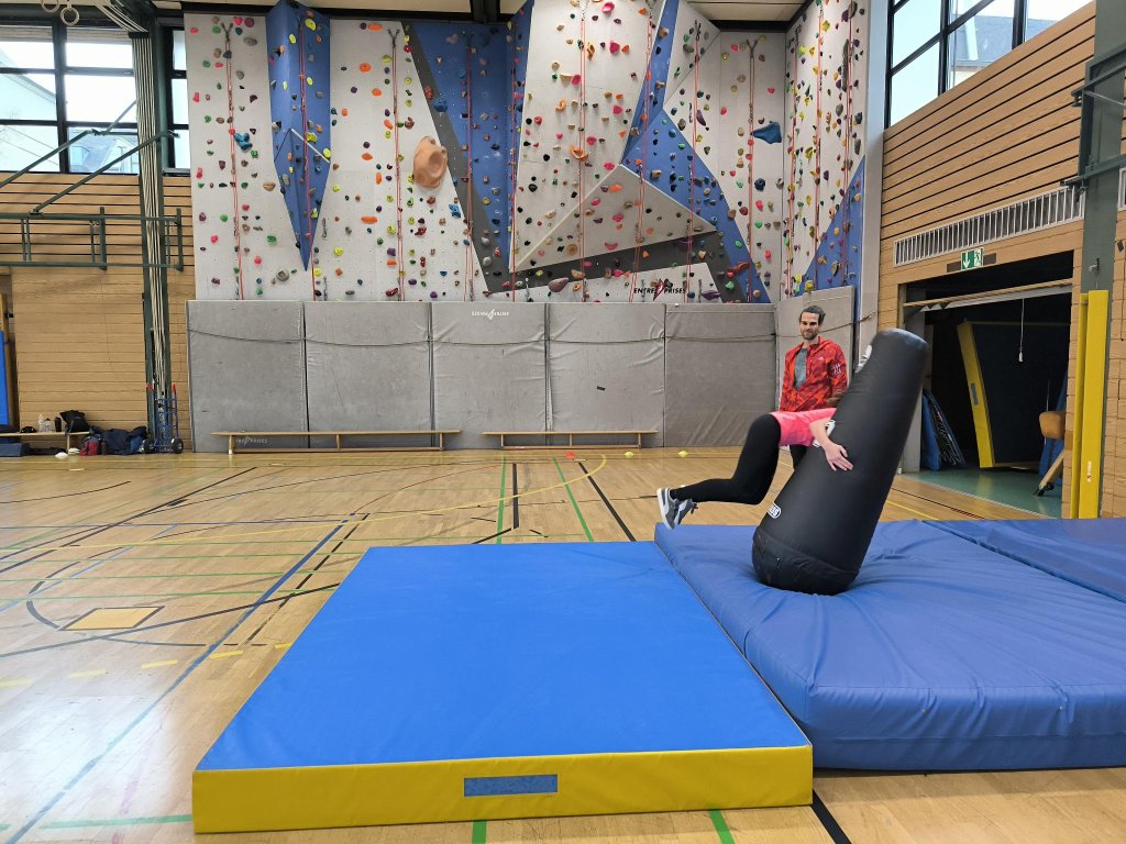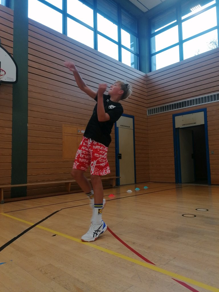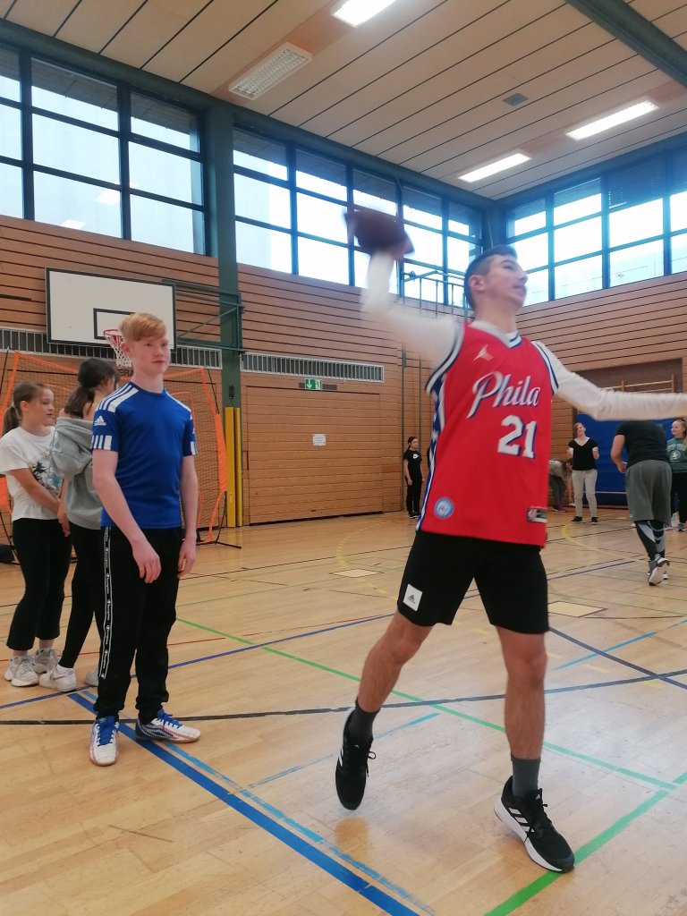 Einen Zaungast hatten wir auch: Ganz unverhofft kam Frau Hofmann auf der Suche nach ein paar Schülern dazu und hat es sich nicht nehmen lassen, ebenfalls ein paar Bälle mit uns zu werfen. Ihr Entzücken drückte sie so aus: „Das ist ja witzig, wenn diese lustigen Eierbälle kreuzdiquer durch die ganze Halle springen!“ Es folgte ein begeistertes Kichern und weg war sie.