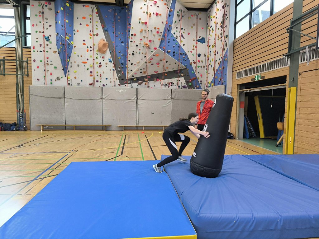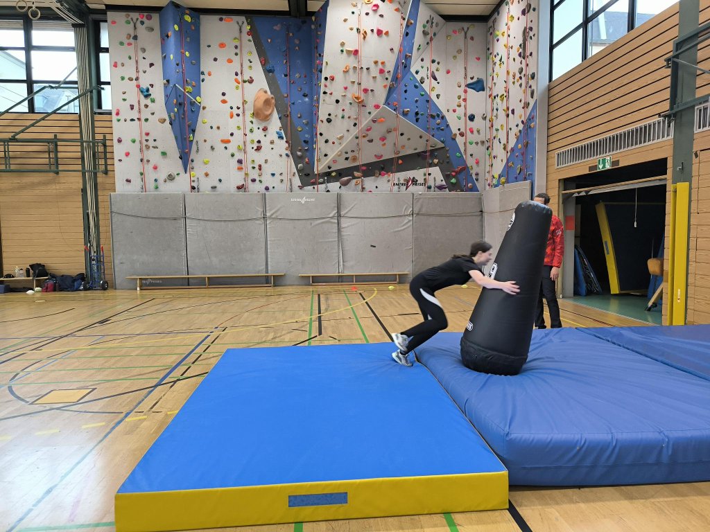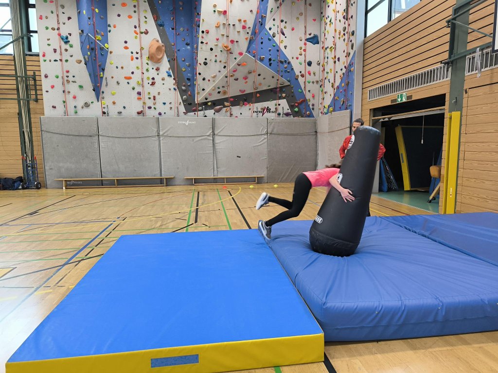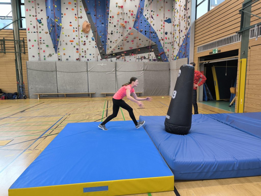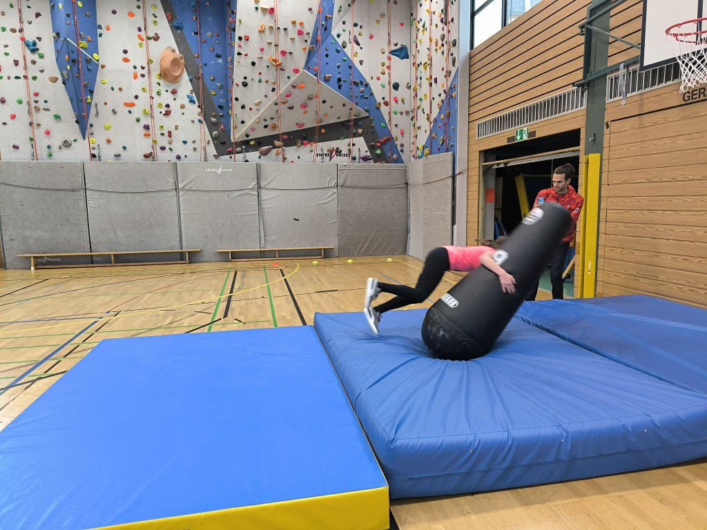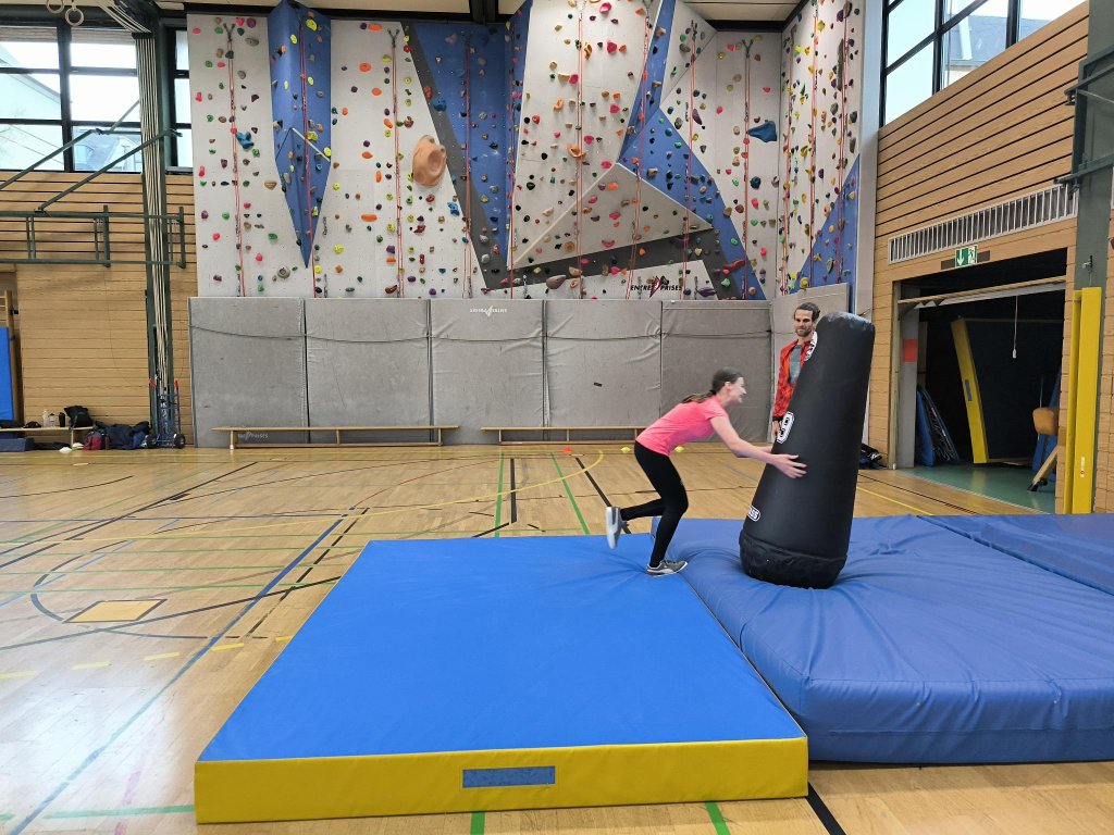 Einen Zaungast hatten wir auch: Ganz unverhofft kam Frau Hofmann auf der Suche nach ein paar Schülern dazu und hat es sich nicht nehmen lassen, ebenfalls ein paar Bälle mit uns zu werfen. Ihr Entzücken drückte sie so aus: „Das ist ja witzig, wenn diese lustigen Eierbälle kreuzdiquer durch die ganze Halle springen!“ Es folgte ein begeistertes Kichern und weg war sie.