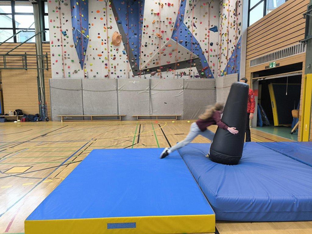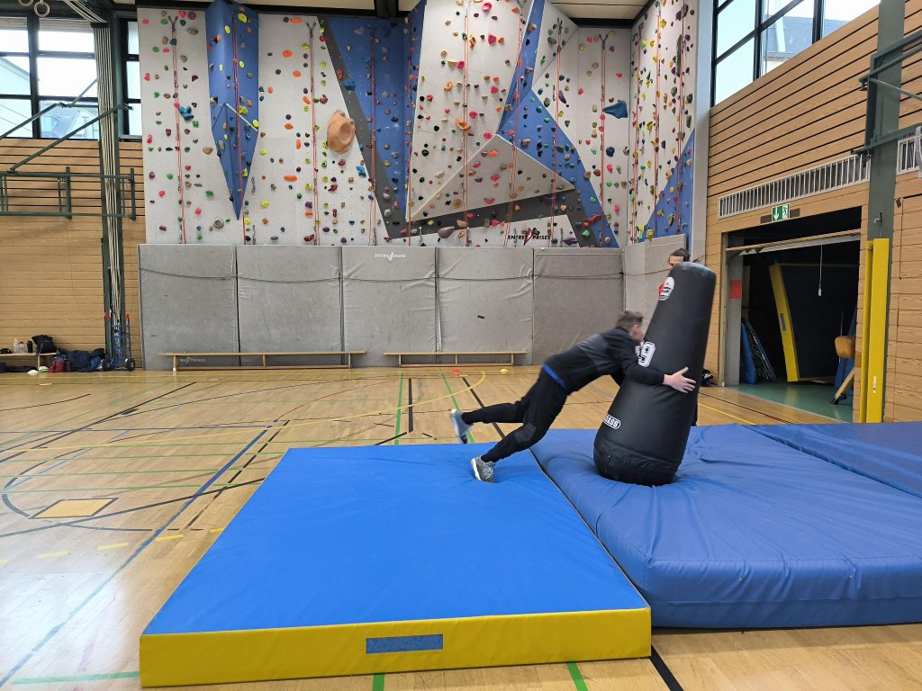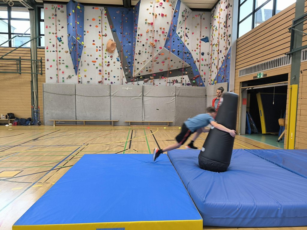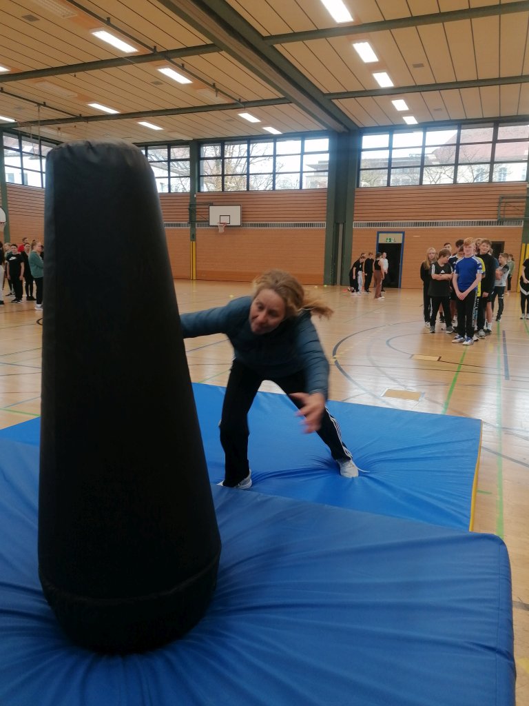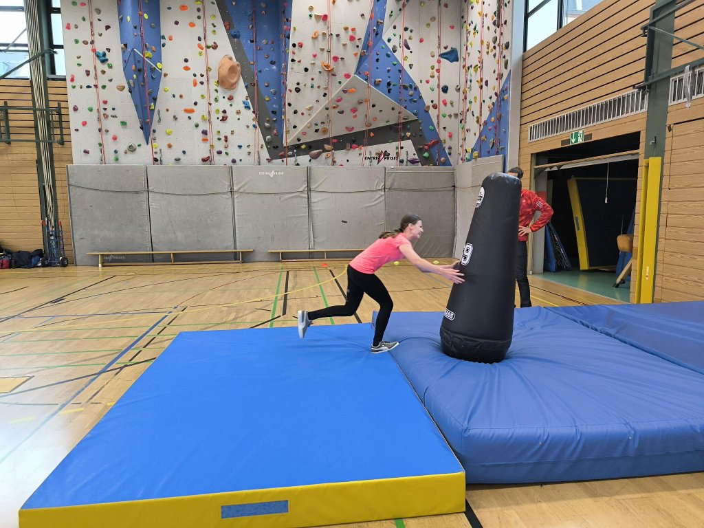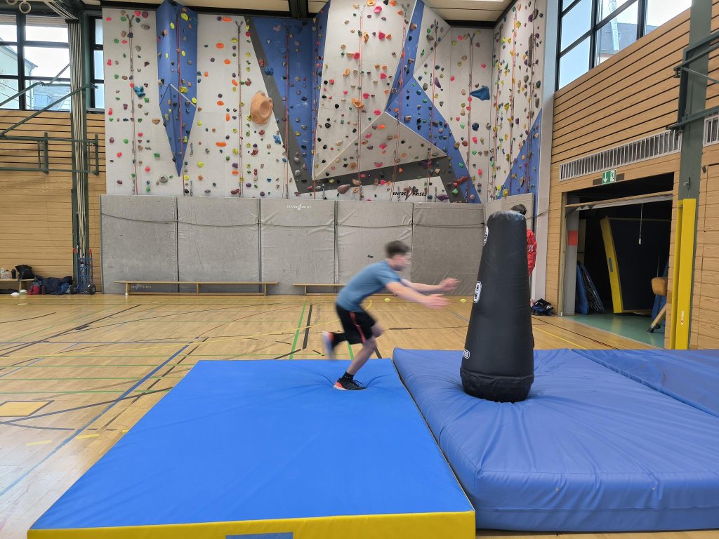 Einen Zaungast hatten wir auch: Ganz unverhofft kam Frau Hofmann auf der Suche nach ein paar Schülern dazu und hat es sich nicht nehmen lassen, ebenfalls ein paar Bälle mit uns zu werfen. Ihr Entzücken drückte sie so aus: „Das ist ja witzig, wenn diese lustigen Eierbälle kreuzdiquer durch die ganze Halle springen!“ Es folgte ein begeistertes Kichern und weg war sie.