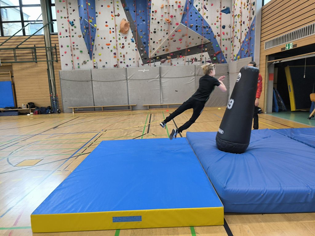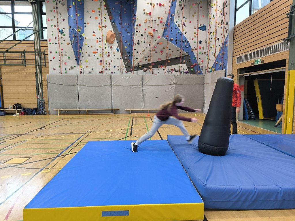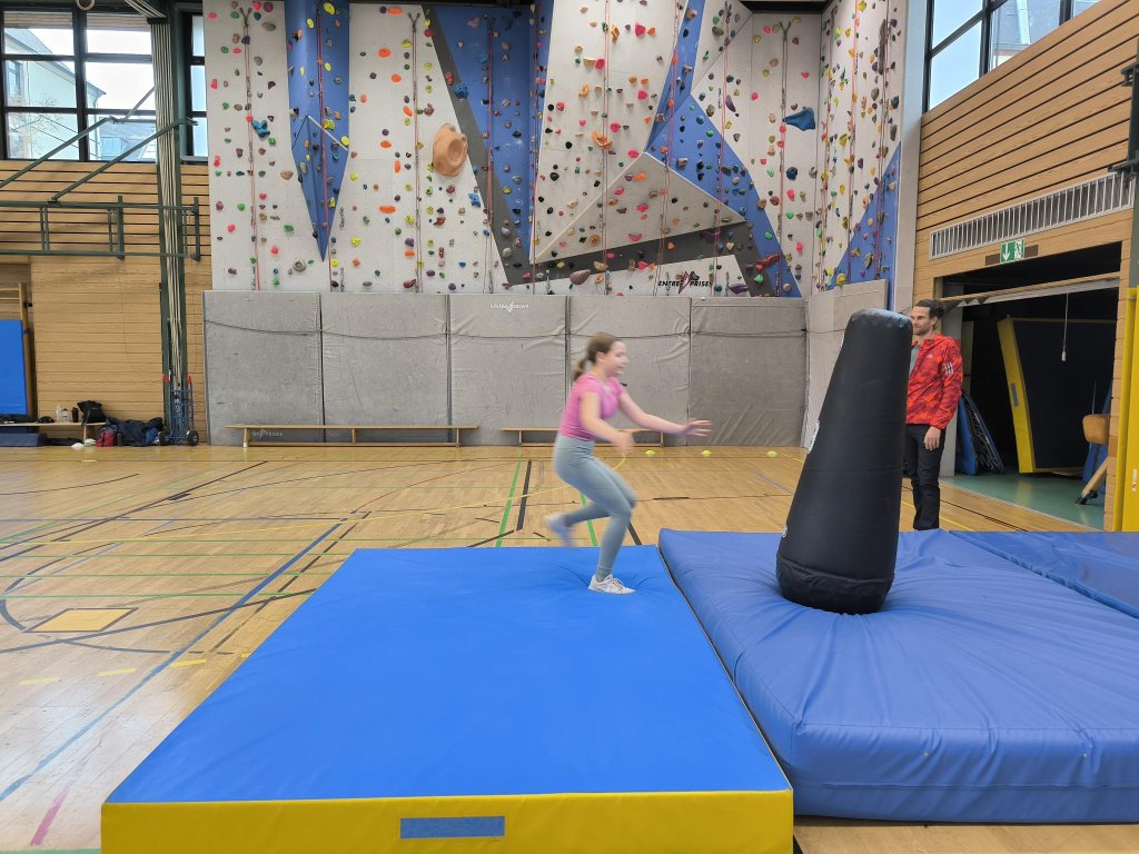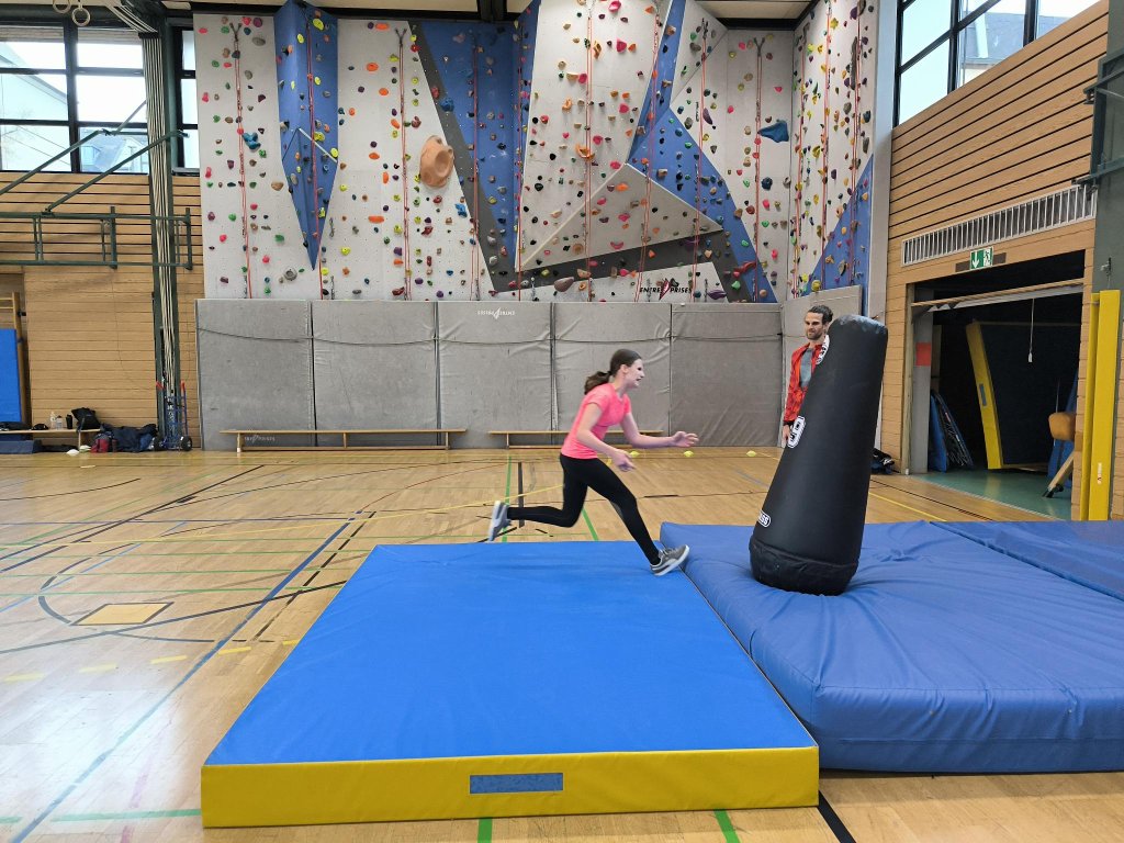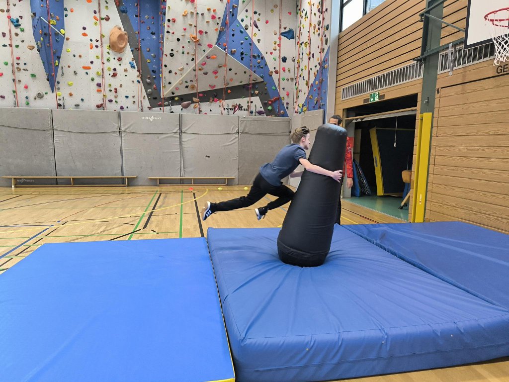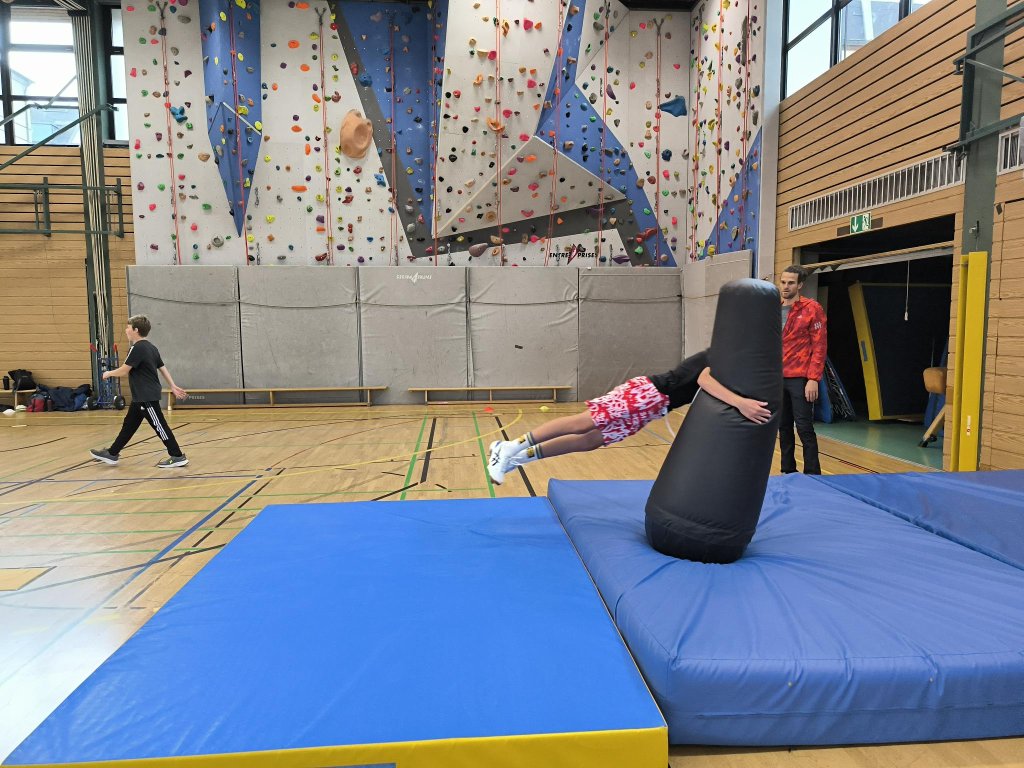 Einen Zaungast hatten wir auch: Ganz unverhofft kam Frau Hofmann auf der Suche nach ein paar Schülern dazu und hat es sich nicht nehmen lassen, ebenfalls ein paar Bälle mit uns zu werfen. Ihr Entzücken drückte sie so aus: „Das ist ja witzig, wenn diese lustigen Eierbälle kreuzdiquer durch die ganze Halle springen!“ Es folgte ein begeistertes Kichern und weg war sie.