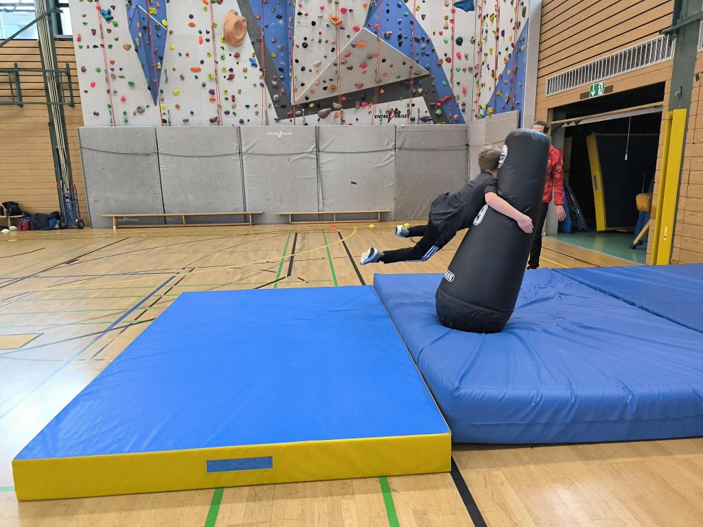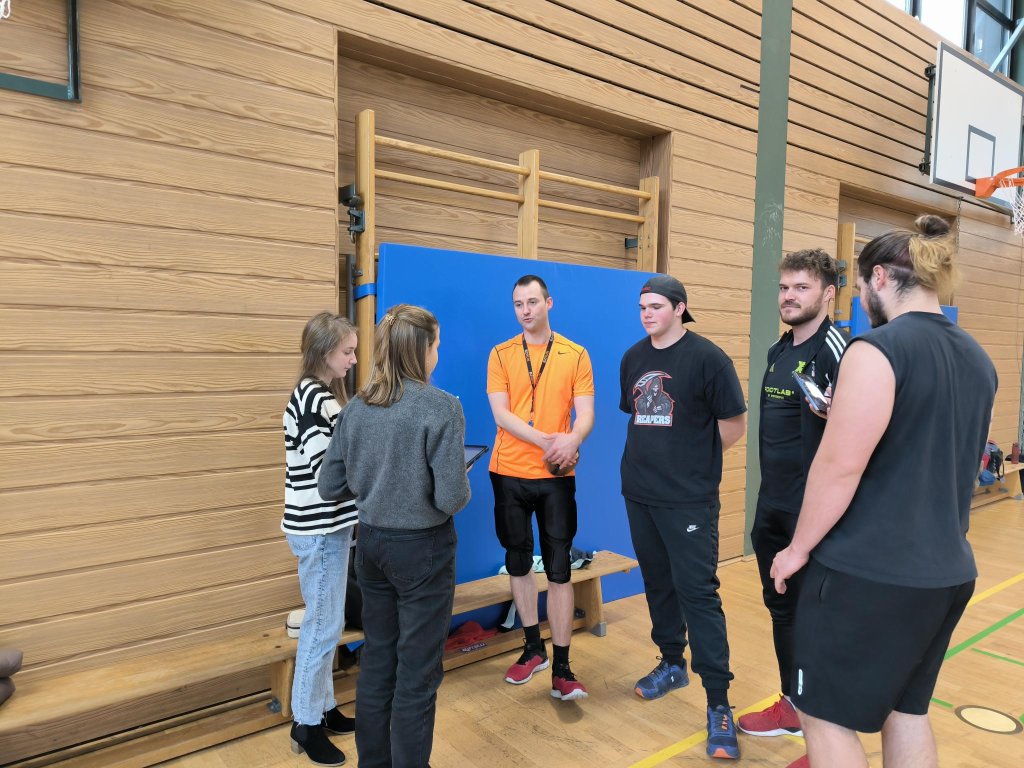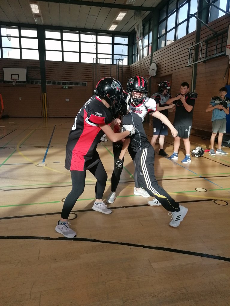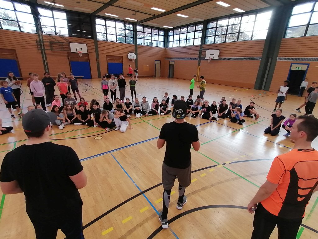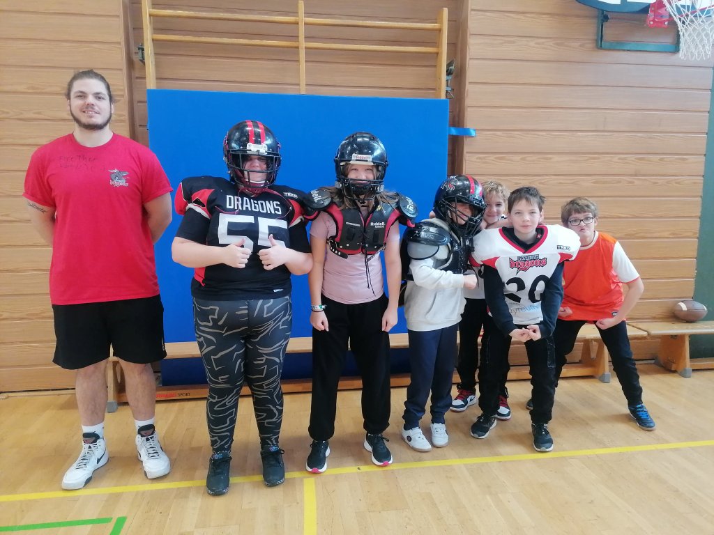 Und die Schüler? Im Allgemeinen war die Begeisterung doch erstaunlich groß. Einem Interview mit ein paar Schülerinnen und Schülern der siebten Klassen konnten wir entnehmen, dass sie es „richtig cool“ gefunden hätten, dass die Dragons überhaupt an die Schule gekommen seien, und dankbar für die Chance wären, dieses „komplett andere Gefühl“ zu erleben, eine Sportart, die man sonst nur aus dem Fernsehen kenne. Manche von den Siebtklässlern (nämlich diejenigen, die in dieser Woche auch ihre Intensivierungsstunde im Sport gehabt haben) hat es sogar doppelt mit dem Probetraining erwischt. Unnötig oder gar lästig, wollten wir wissen?