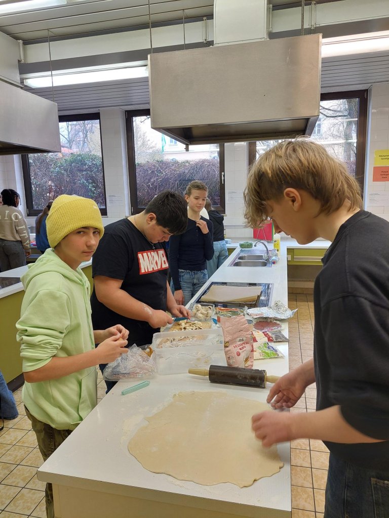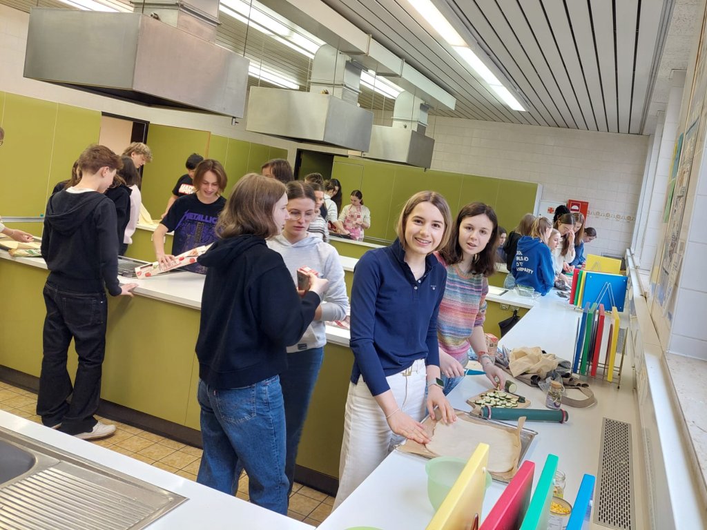 Pünktlich zum Halbjahr versammelte sich die 8. und 9. Klasse Italienisch des neusprachlichen Zweiges in der hauseigenen Schulküche des RWGs, um mit Frau Beer und Herrn Dörfler Pizza zu backen. Was im Unterricht bislang theoretisch besprochen wurde, nämlich dass eine typische cena aus antipasti, primo, secondo und dolce besteht und wie die entsprechenden Lebensmittel in der Zielsprache heißen, wurde nun auch im Praxistest erprobt.