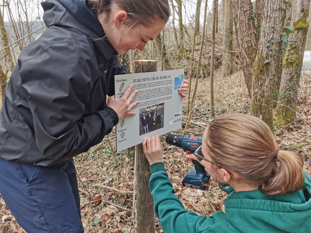 „Wir wollen ein Zeichen dafür setzen, dass jede und jeder seinen Beitrag gegen den Klimawandel leisten kann“, sagte eine Schülerin des P-Seminars „Zukunfts(tr/b)äume“. Dabei pflanzte sie mit rund 50 Helferinnen und Helfern aus der RWG-Schulfamilie Bäume, die gut an die sich ändernden klimatischen Bedingungen angepasst sind.