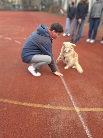 Mit viel Motivation übten die Achtklässler auf dem Hartplatz Befehle wie „Seduta!“ (Sitz!), „Resta!“ (Bleib!), „Vai!“ (Lauf!), „Prendi!“ (Nimm!) und „Lascia!“ (Lass!). Bella ließ sich – nachgeholfen durch den ein oder anderen biscottino – nicht zweimal bitten und zauberte mit ihrer geduldigen Mitarbeit allen ein Lächeln ins Gesicht.