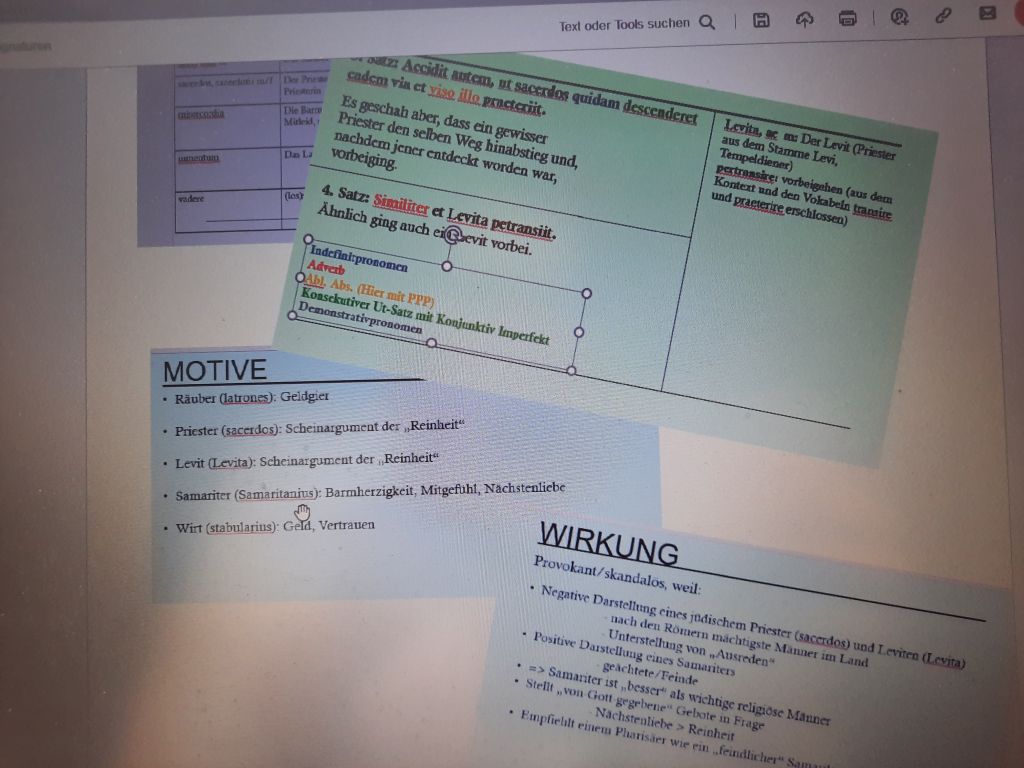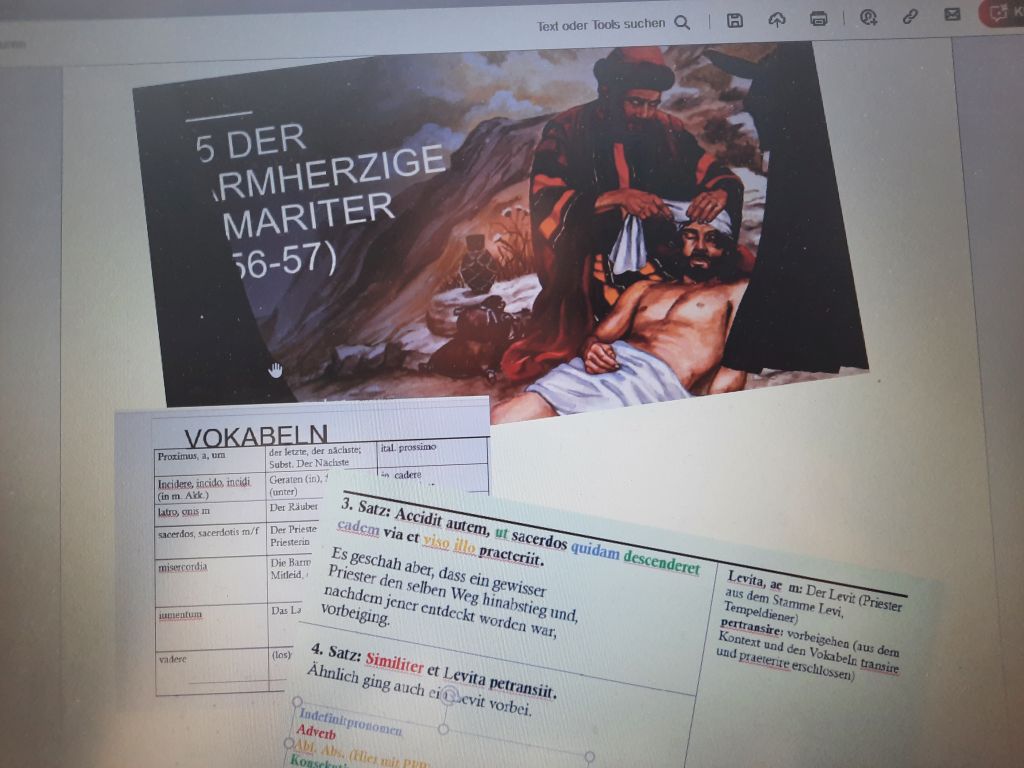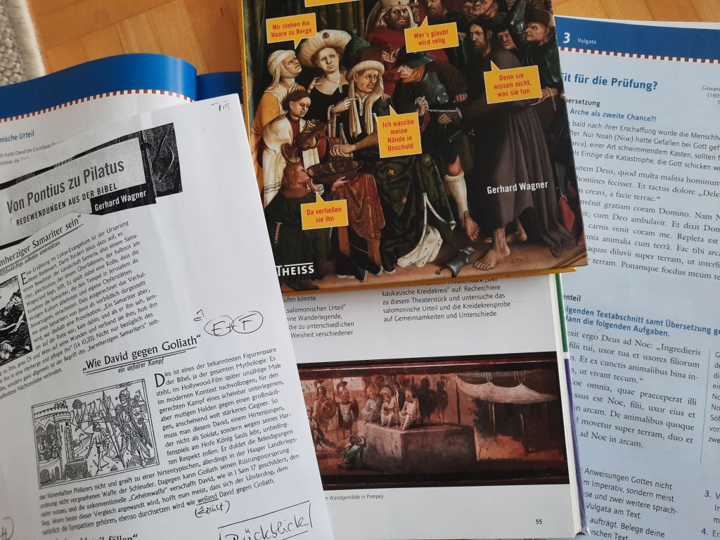 Die Textgrundlage bildeten dabei kurze Erzählungen (z.B. Joseph und seine Brüder, die Arche Noahs) bzw. biblische Gleichnisse (u.a. David gegen Goliath, Das salomonische Urteil, Der barmherzige Samariter), welche es zunächst aus der lateinischen Version der Vulgata ins Deutsche zu übertragen galt; außerdem sollten die Schüler/-innen zusätzliche Erklärungen zu grammatikalischen Phänomenen vornehmen, interpretatorische Aufgaben zum Text bearbeiten oder aber das Fortleben sprichwörtlicher Redensarten beleuchten, die – ehemals der Bibel entlehnt – bis heute Eingang in unseren Sprachgebrauch gefunden haben.