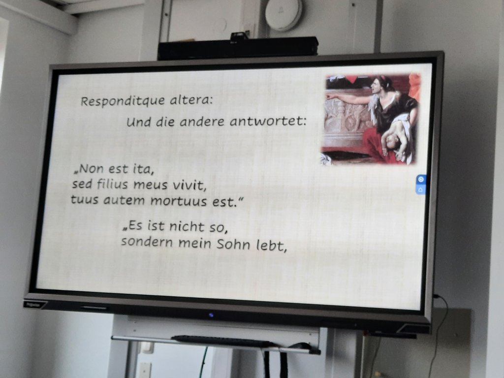 Spätestens zur Osterzeit rückt mit der Auferstehungsgeschichte von Jesus von Nazareth das Buch der Bücher, nämlich die Bibel, in den Fokus gläubiger Christen. Auch im Lateinunterricht der 9. Jgst. steht die ‚volkstümliche‘ Version der lat. Bibelübersetzung, die sog. Vulgata, im Zentrum der Übergangslektüre: So befasste sich die Lateingruppe 9abe bereits in der Zeit vor Weihnachten mit einem ca. 14-tägigen Projekt zum genannten Thema.