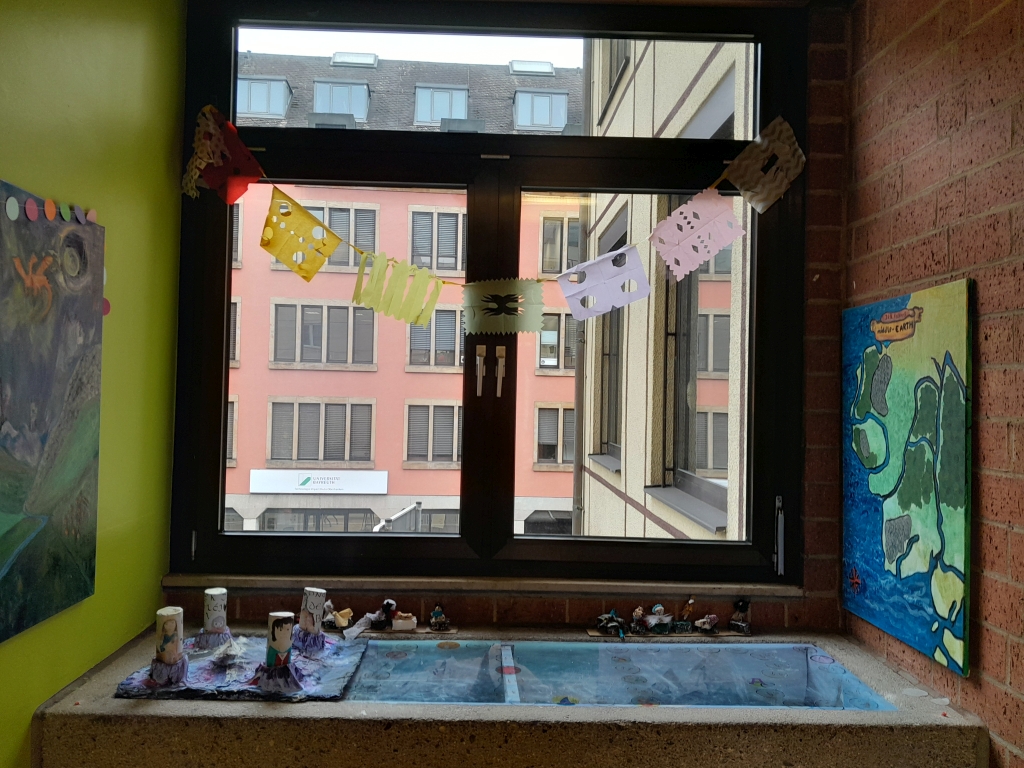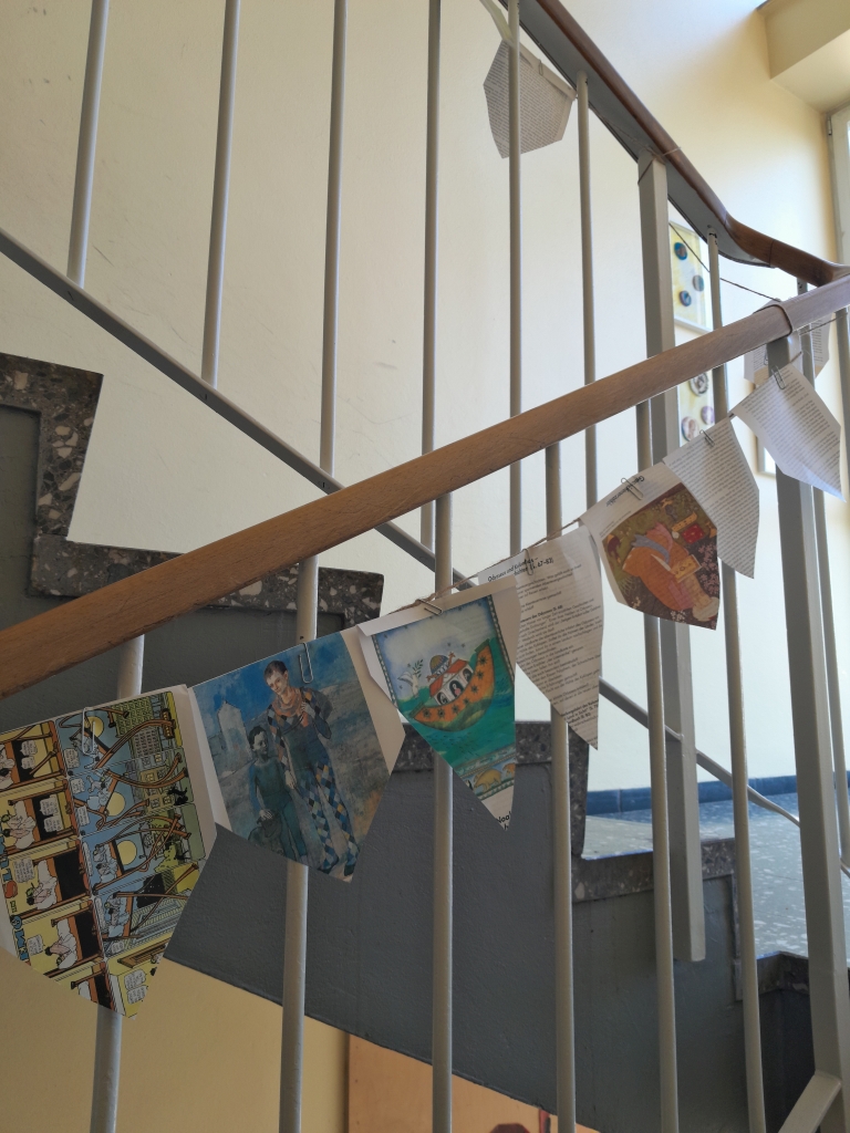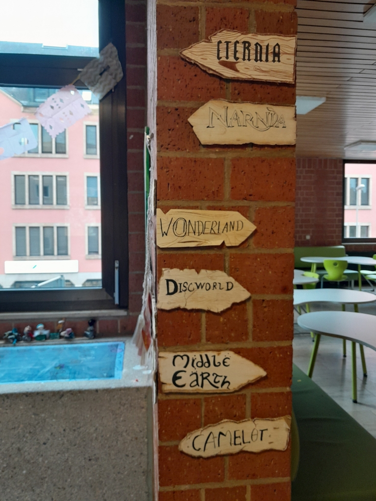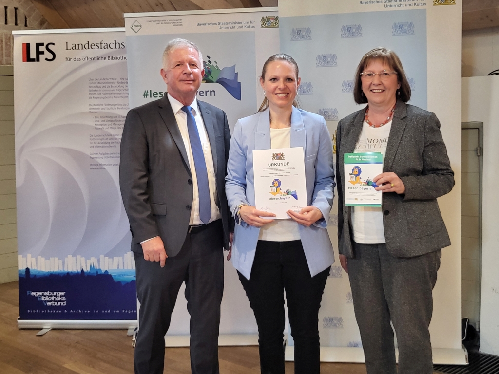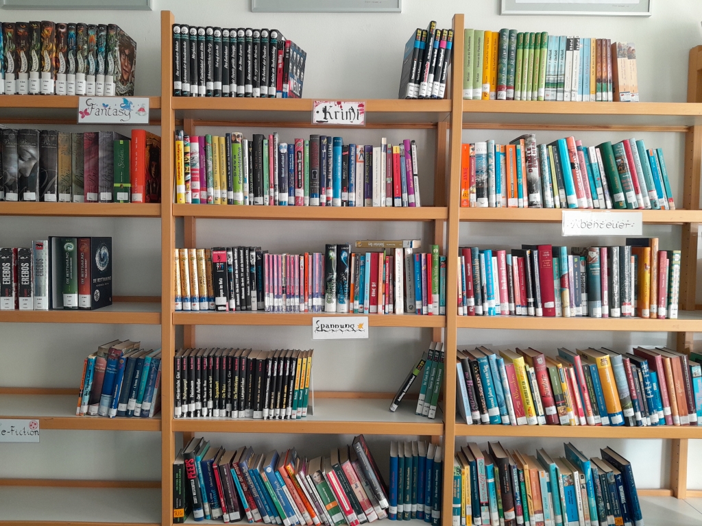 Wir freuen uns und sind sehr stolz darauf, dass die Arbeit des Teams nicht nur an unserer Schule geschätzt wird, sondern nun auch mit dem Gütesiegel „Treffpunkt Schulbibliothek – Fit in den Medien!“ ausgezeichnet wurde. Dieses wird vom Kultusministerium an hervorragende Schulbibliotheken vergeben: „Die prämierten Schulbibliotheken zeichnen sich durch ein besonders attraktives und vielseitiges Medienangebot, innovative Leseförderprojekte sowie deren systematische Integration in den Unterricht aus. Sie leisten damit einen entscheidenden Beitrag in der Vermittlung von Lese-, Medien- und Informationskompetenz“, heißt es aus München. Gefeiert wurde diese Auszeichnung an der Schule mit einem Bibliothekstag. Schülerinnen und Schüler der fünften Klassen spannten eine selbstgebastelte Wimpelgirlande im Schulhaus, welche die beiden Bibliotheksräume symbolisch miteinander verbindet. Zudem wurde ein Bücherflohmarkt veranstaltet, bei dem sich alle begeisterten Leseratten gegen eine kleine Spende mit neuem Futter versorgen konnten.