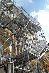 Nicht von alledem stimmt: Die Treppen sind Notausgänge, die ein zeitgemäßes Sicherheitskonzept zwingend vorschreibt. Auf keinen Fall darf es passieren, dass jemandem bei einem Brand im Altbau der Rückzug zum Treppenhaus abgeschnitten wird. Die Treppentürme stellen also einen Notausgang dar, der im Brandfall helfen soll, Leben zu retten. Er ist nur ein Provisorium und wird schließlich durch eine permanente Leiter ersetzt, die dem gleichen Zweck dienen soll.