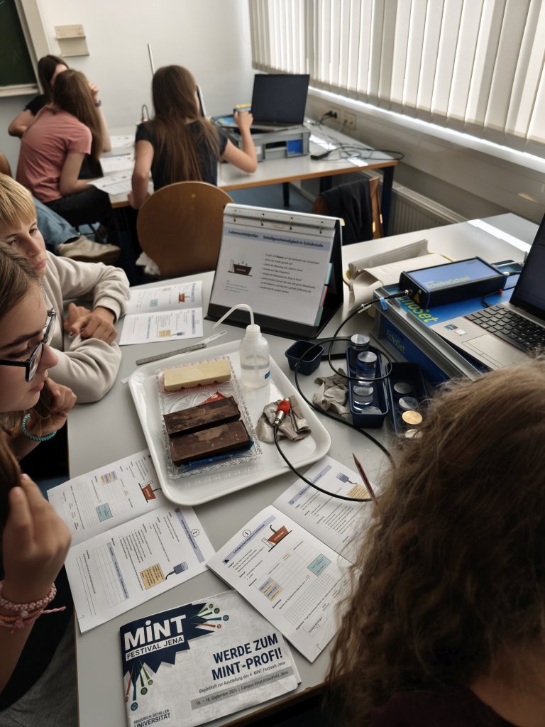 Im Anschluss wurde der Workshop „Beyond the Sound: Ultraschallphänomene experimentell erforschen“ besucht. In den nun folgenden 90 Minuten wurden unter anderem in Gelatine nach verborgenen Leitungen gesucht und die Schokoladendicke von einem Ü-Ei bestimmt.