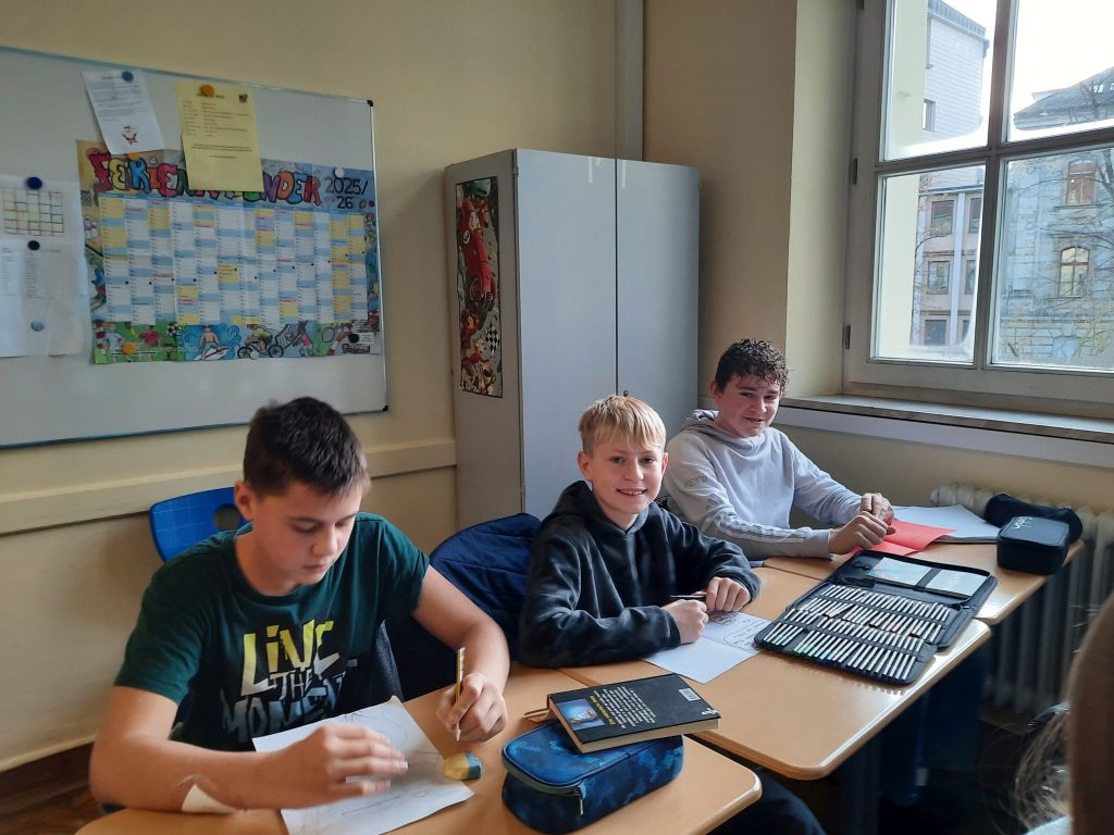 Und die Klassenleiterin und Deutschlehrerin hatte noch eine Überraschung vorbereitet: Alle Kinder bekamen zusätzlich zu den 24 Gedichten auch noch einen druckfrischen Kalender 2026 zum Selbstgestalten, in den nun Monat für Monat die einzelnen Schülerbeiträge platziert wurden. Die 12 Monatsseiten konnten dabei zusätzlich noch mit passenden Bildchen zur jeweiligen Jahreszeit verziert oder aber mit lustigen Stickern etc. beklebt werden. Hierzu hatten die Schüler/-innen eifrig von zuhause allerlei Bastelmaterialien mitgebracht, welche auch großzügig untereinander ausgetauscht wurden – echtes Teamwork also! Zur Abrundung machte sich die Klasse noch an die Bearbeitung eines individuellen Covers; die Rückseite wurde zudem noch mit einer Übersicht beklebt, die mit den Gedichttiteln, Autoren und den jeweiligen Gestaltern aus der 6a bedruckt war.