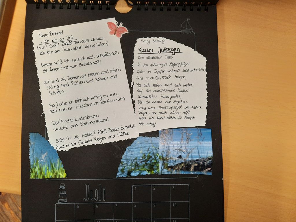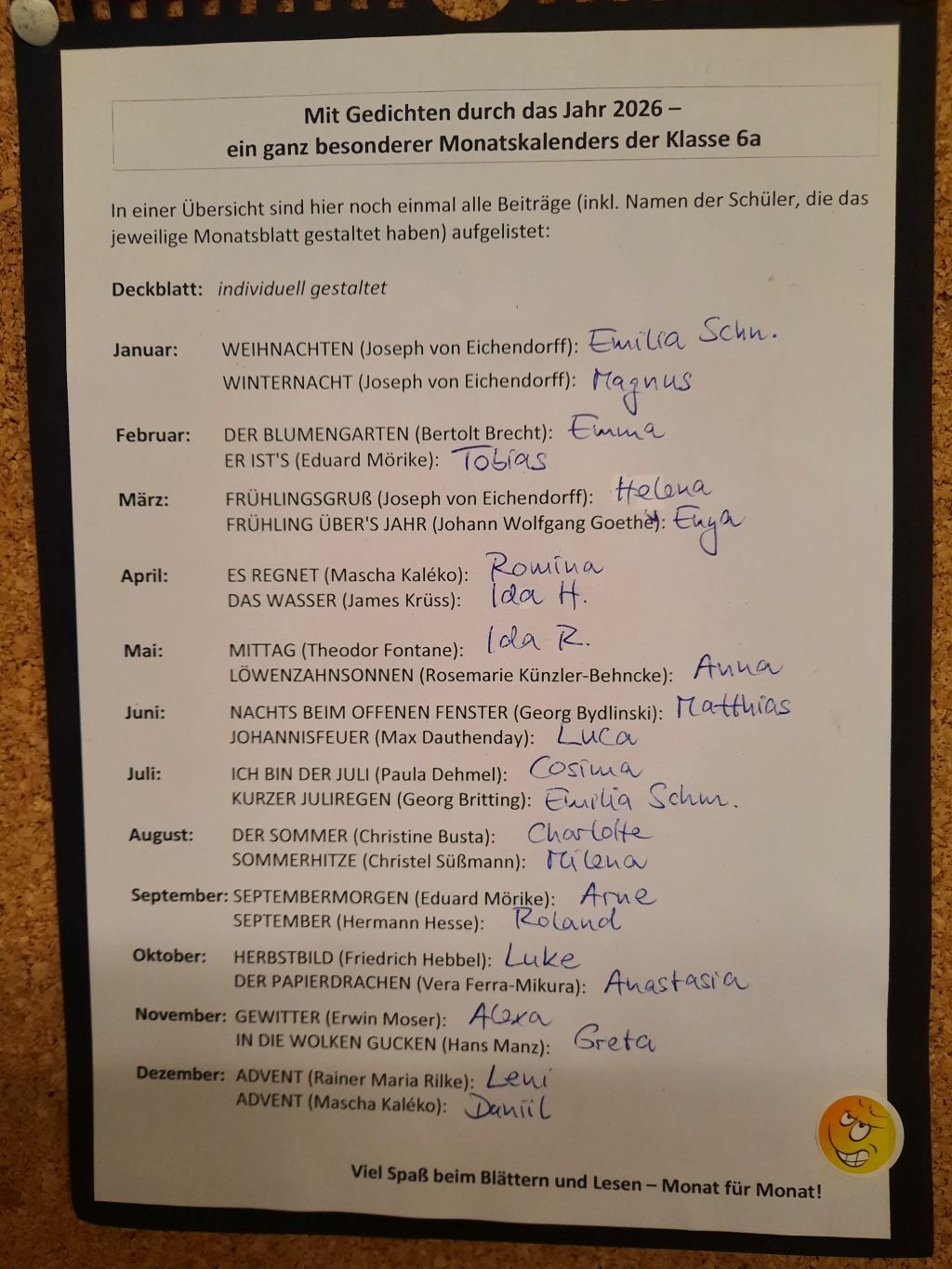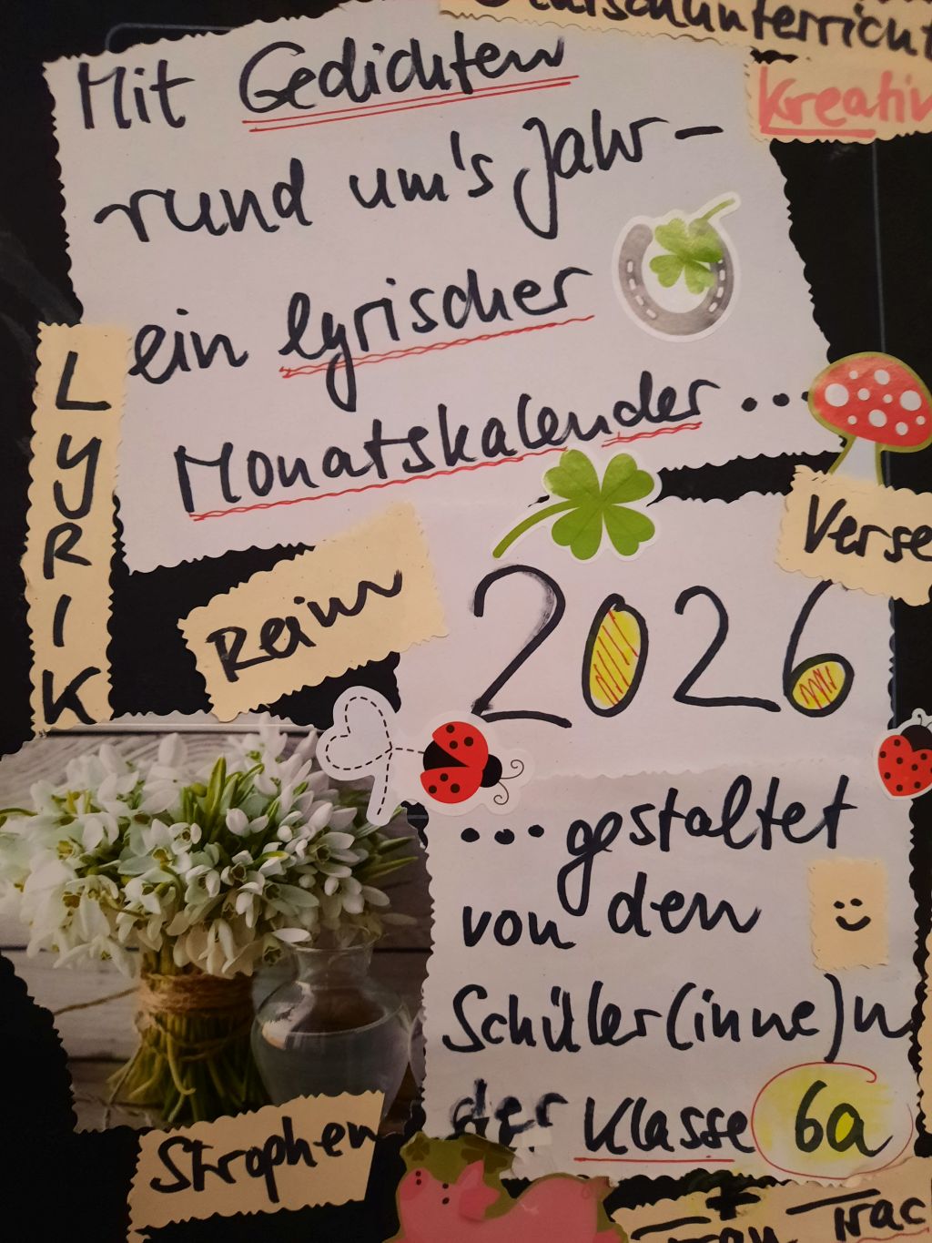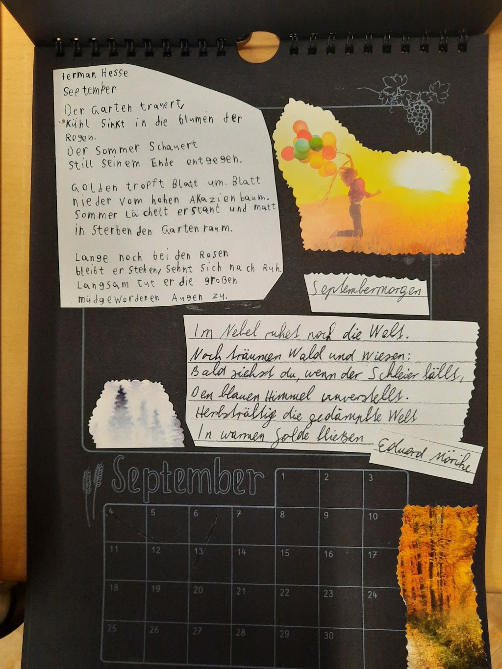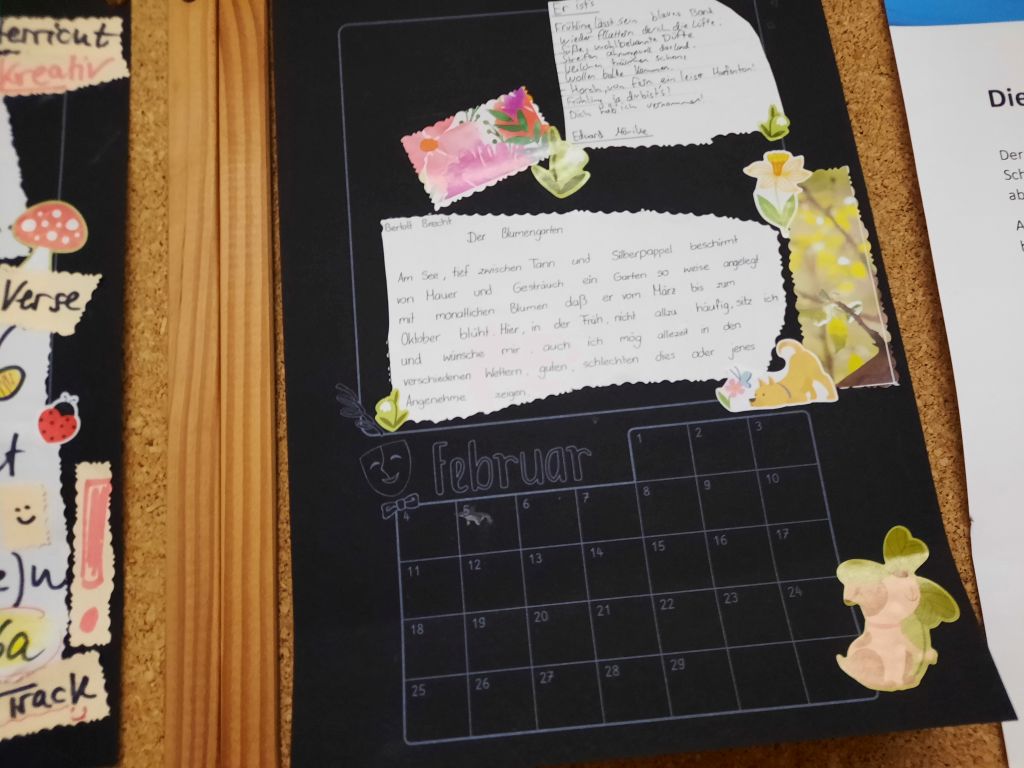 Der Beginn eines neuen Aufsatzthemas im Fach Deutsch startete durchaus kreativ im Klassenzimmer der 6a: Die Schüler/-innen bastelten zum Thema Gedichte einen lyrischen Monatskalender, den die sie als Projekt während der Deutschstunden erarbeiteten und gestalteten.