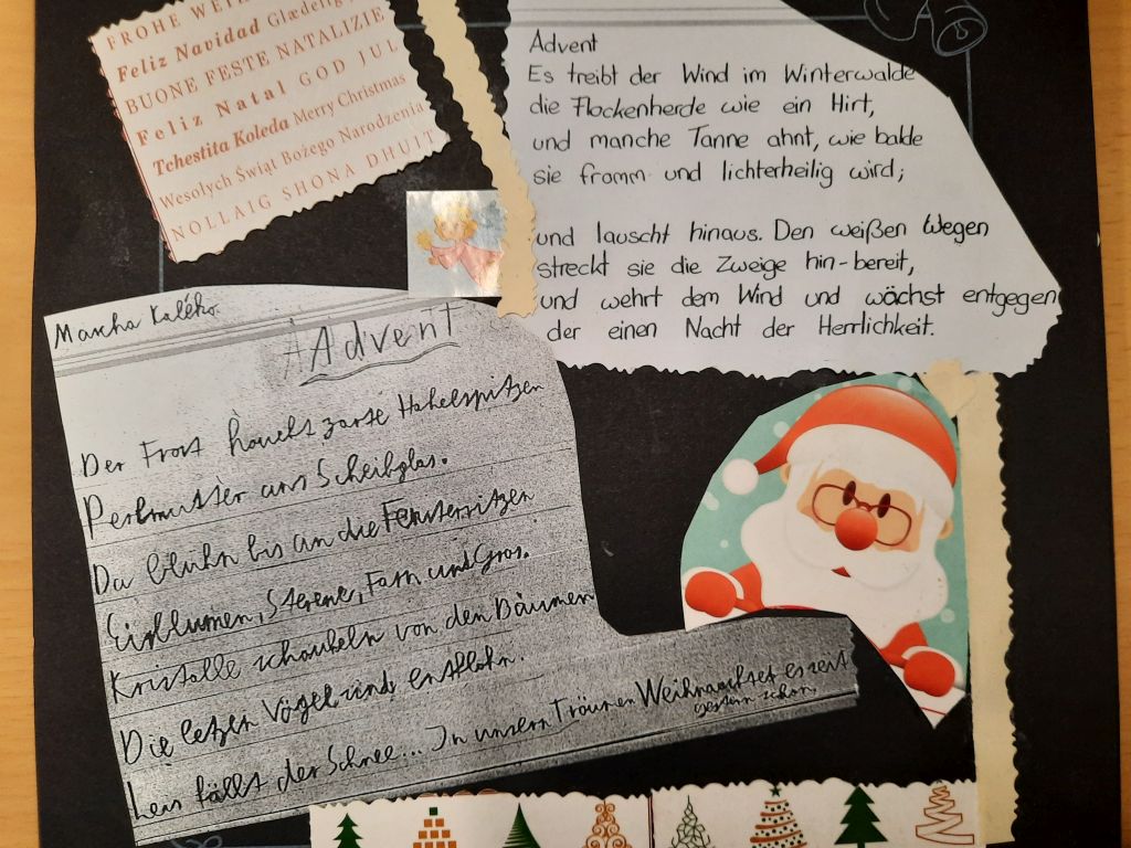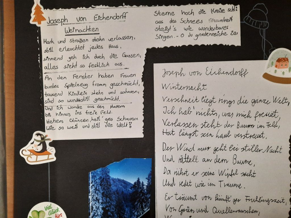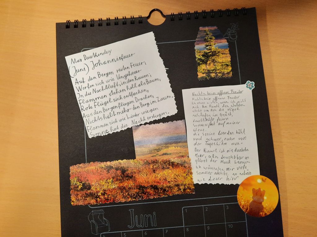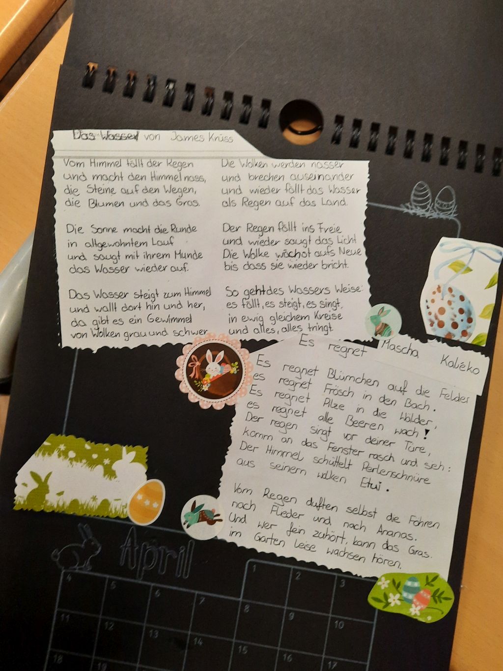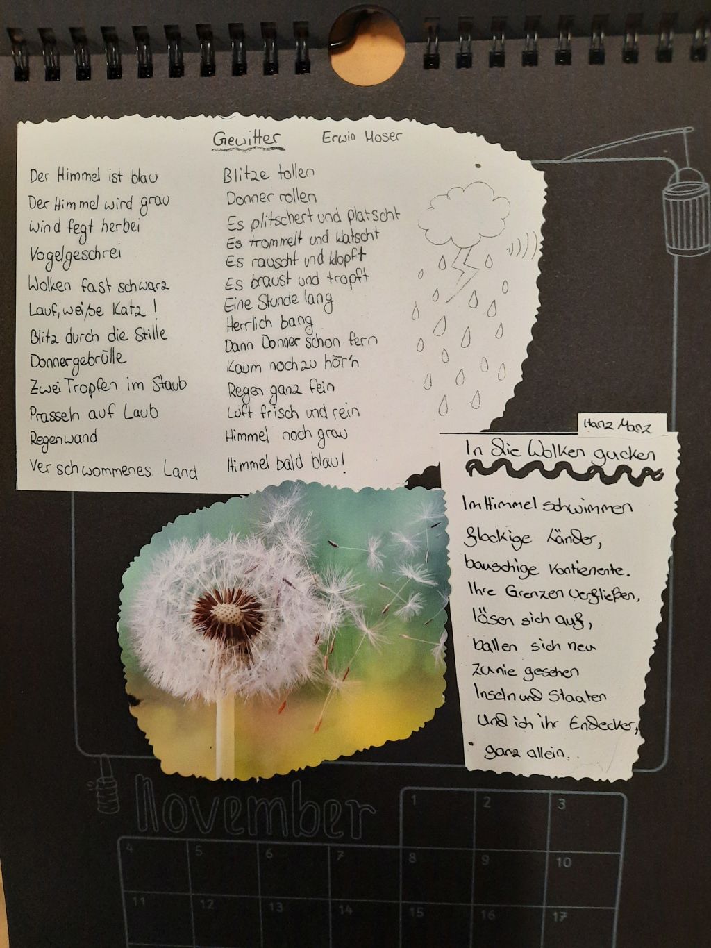 Schließlich konnten sich zuhause Eltern, Großeltern und natürlich die Schüler/innen selbst über den besonderen Kalender freuen. Und das Projekt hatte noch etwas bewirkt in der Klasse: Die Kinder hatten nochmals mit ihrer Deutschlehrerin die Grundkenntnisse über das Gedicht (z.B. die Reimarten, das Metrum etc.) wiederholt; außerdem sollte jede/r zum Abschluss noch sein Gedicht sinntragend betont vor der Klasse vortragen – dies konnte (je nach Textlänge, die doch je nach Auswahl variierte) völlig frei geschehen, durfte aber genauso auch mit einem kurzen Blick auf die Textvorlage zwischendurch geschehen! Somit gab es am Ende nur strahlende Gesichter für die äußerst gelungenen Darbietungen.